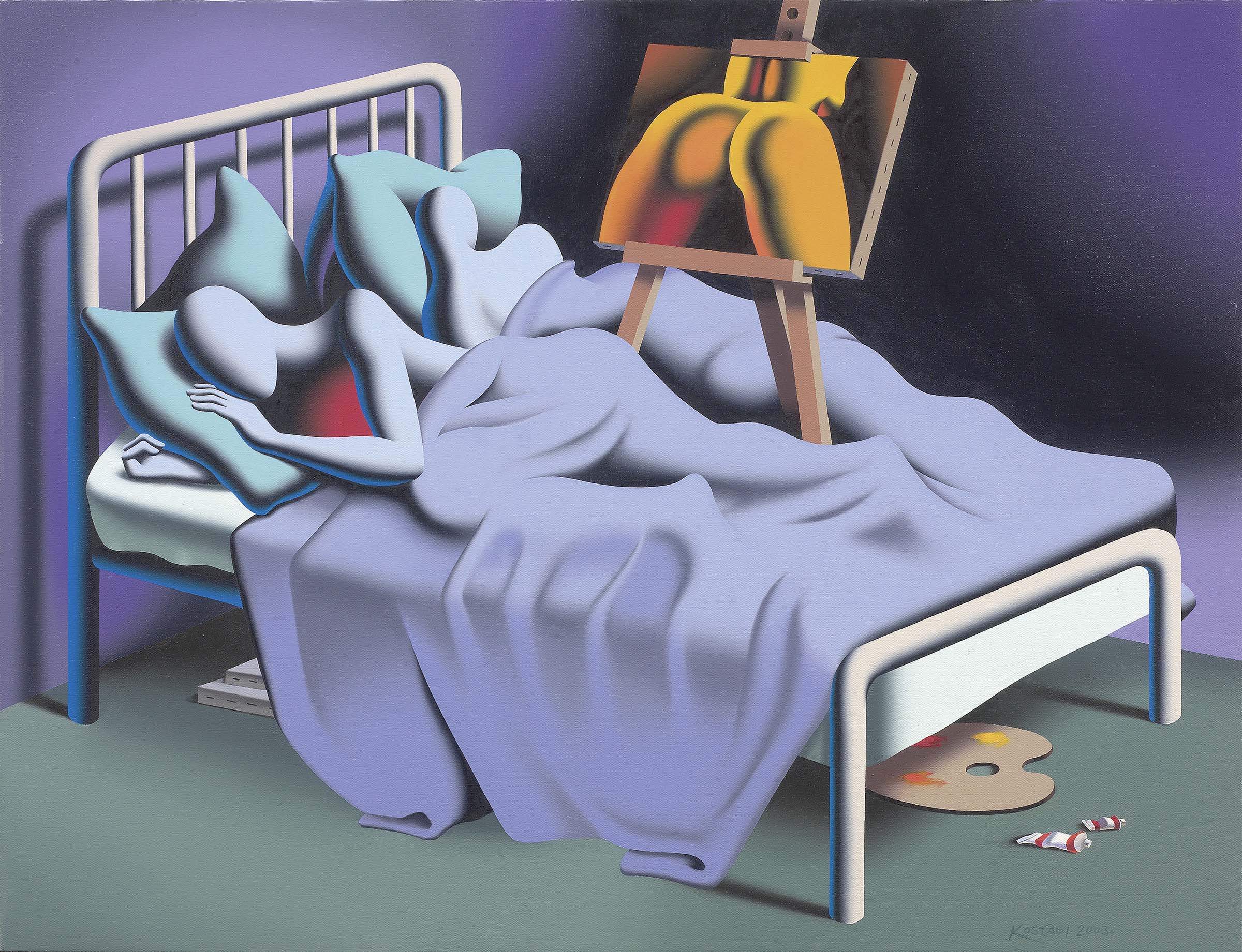 Mark Kostabi Los Angeles 1960 Precius illusion, 2003 Olio su tela, cm. 101x130 Firma e data in basso a destra: Kostabi 2003; al verso sulla tela firma, titolo e data: Mark Kostabi / Precious illusion / 2003 / 2-6-04 Carburetor. Vendita per conto del Tribunale di Livorno.