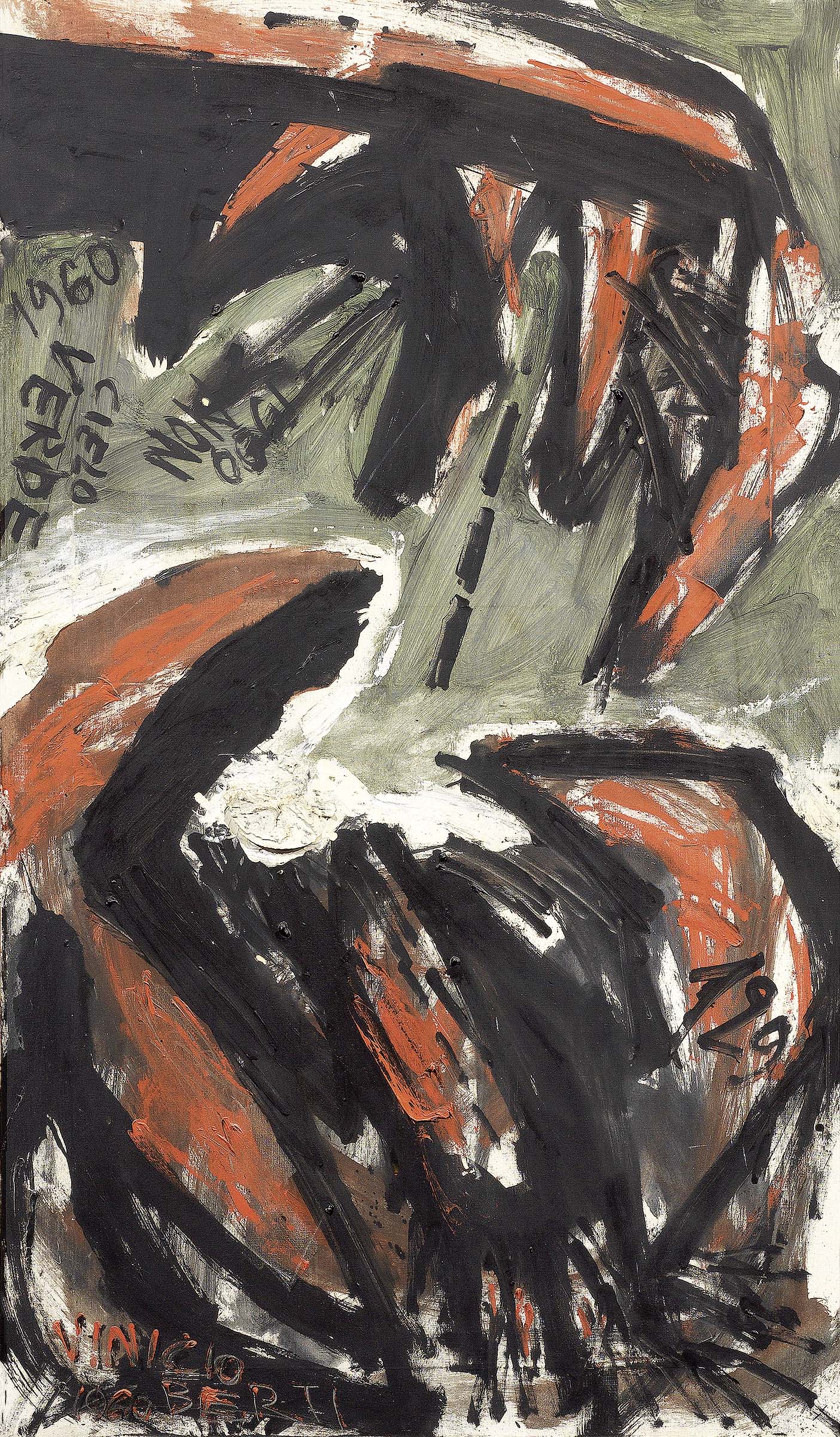 Vinicio Berti Firenze 1921 - 1991 Non oggi, 1960 Olio su tela, cm. 140x80 Firma e data in basso a sinistra: Vinicio / Berti / 1960, data e titolo in alto: Non / Oggi / Cielo / Verde; al verso sulla tela: etichetta Galleria Open Art, Prato, con n. 020; sul telaio: etichetta Premio Naz. di Pittura / Città di Marsala: etichetta Quadrante Studio d'Arte Contemporanea di Matilde Giorgini, Firenze, con n. 20. Storia: Centro Culturale Sarchiani, San Casciano Val di Pesa; Galleria Il Quadrante, Firenze; Collezione privata, Firenze; Galleria Open Art, Prato; Collezione privata Certificato su foto di Liberia Maria Pini Berti, con etichetta Galleria Open Art, Prato, con n. 020. Esposizioni: Mostra d'Arte Contemporanea, San Casciano Val di Pesa, Centro Culturale Sarchiani, 1962.