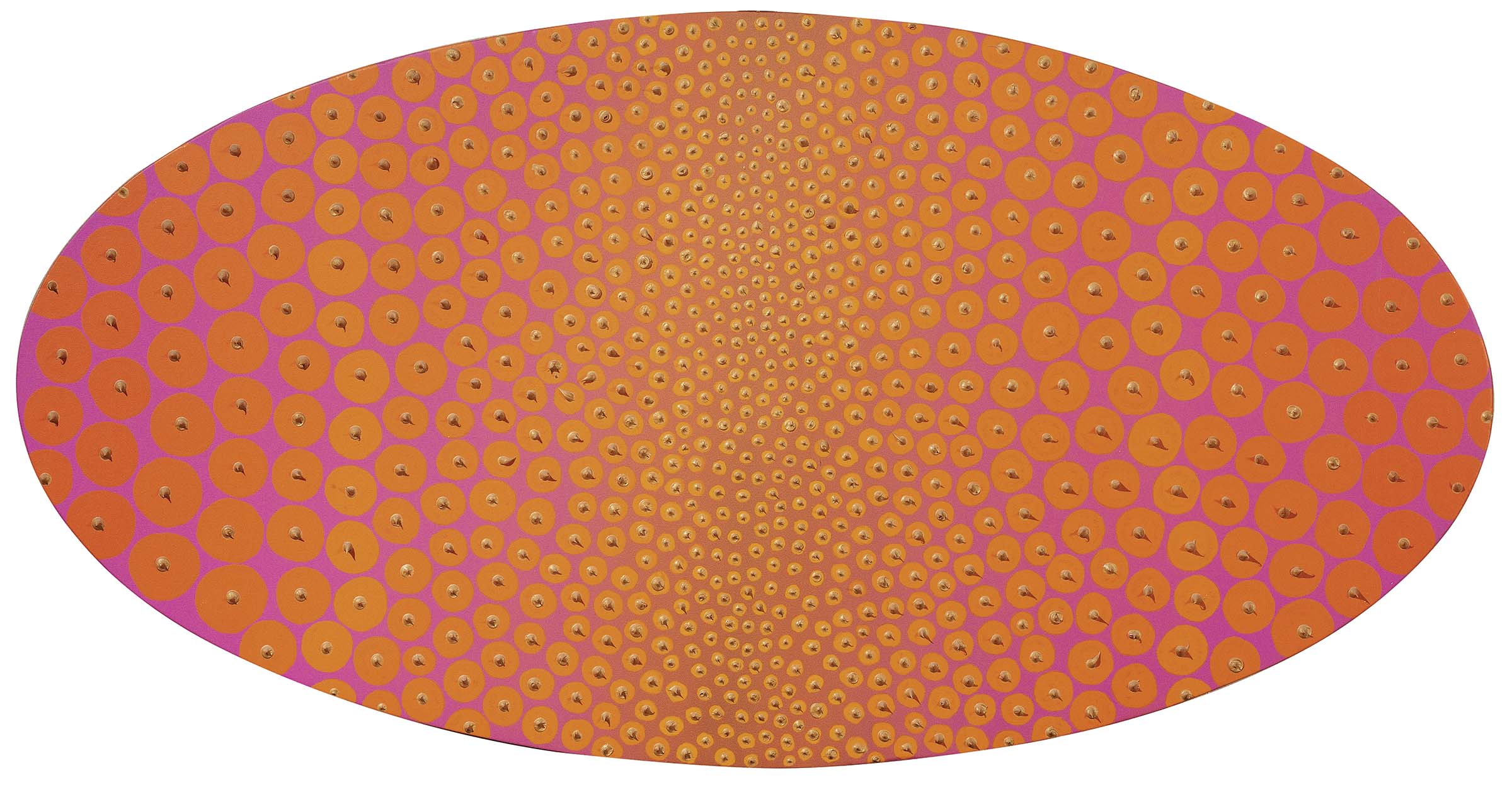 Jorrit Tornquist Graz 1938 Pelle d'Oriente, 2004 Acrilico su tela, cm. 92,5x181, ovale Firma, data e titolo al verso sulla tela e sul telaio: Tornquist / 2004 / Pelle d'Oriente; sul telaio: due timbri Studio f.22 / Modern Art Gallery / Palazzolo sull'Oglio. Foto autenticata dall'artista con etichetta Studio f. 22 Modern Art Gallery, Palazzolo sull'Oglio.