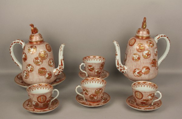 Servizio da tè in porcellana composto da quattro tazze con piattino, due teiere e un piatto portadolci. Cina. XIX secolo.