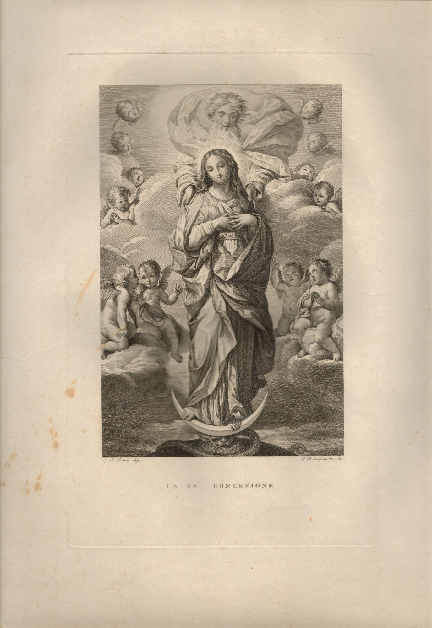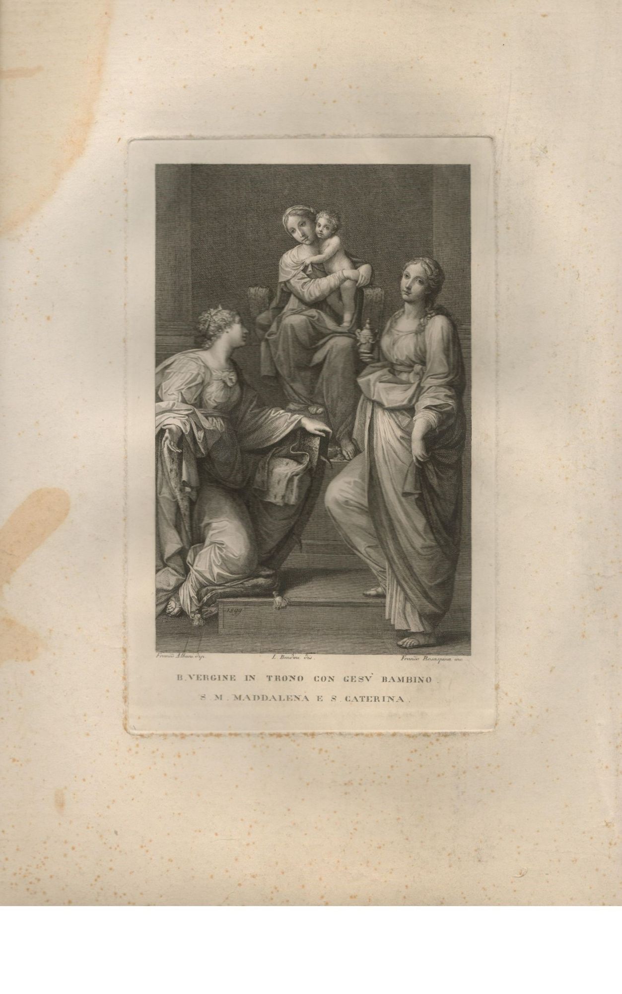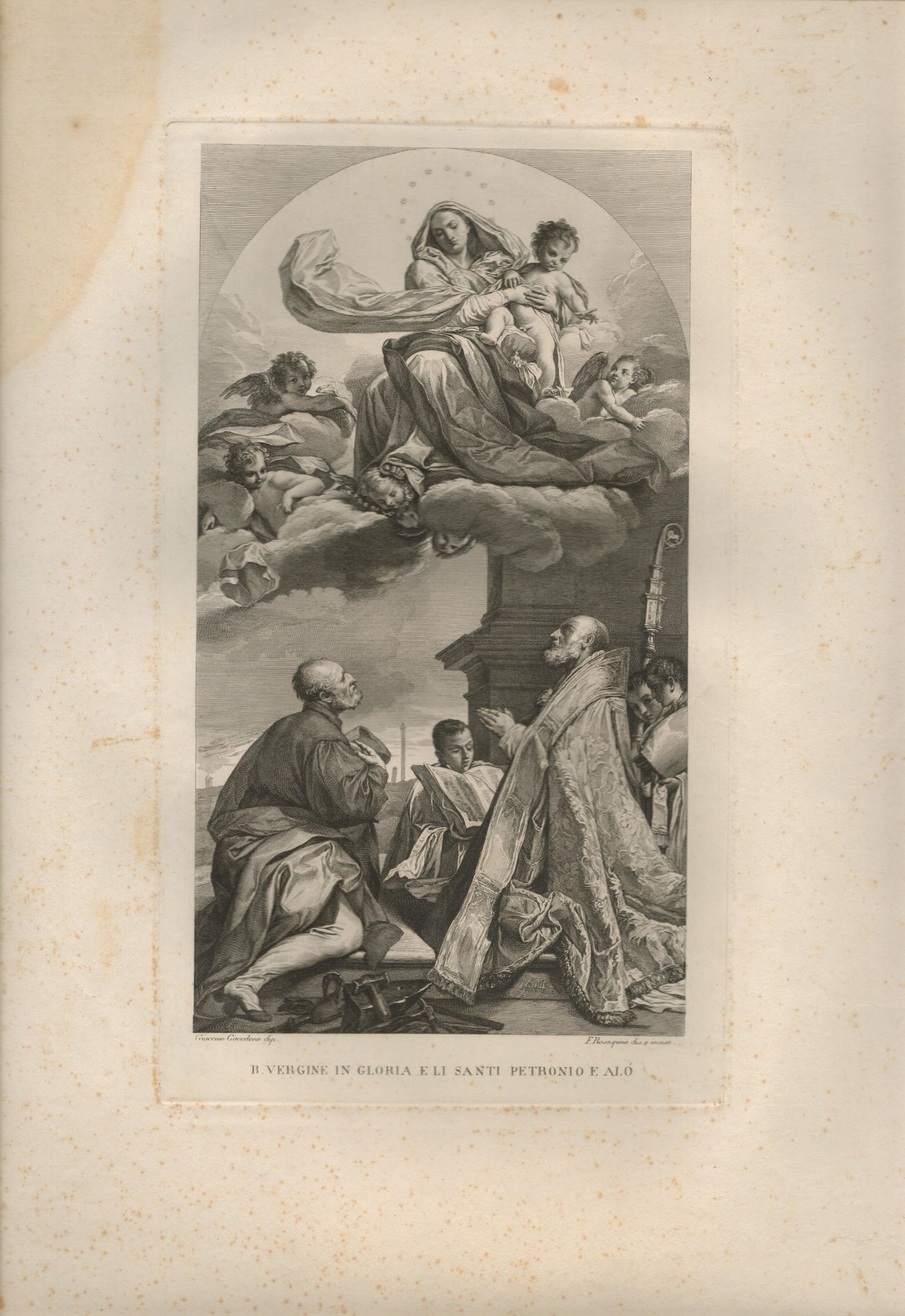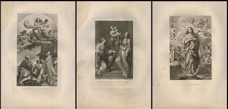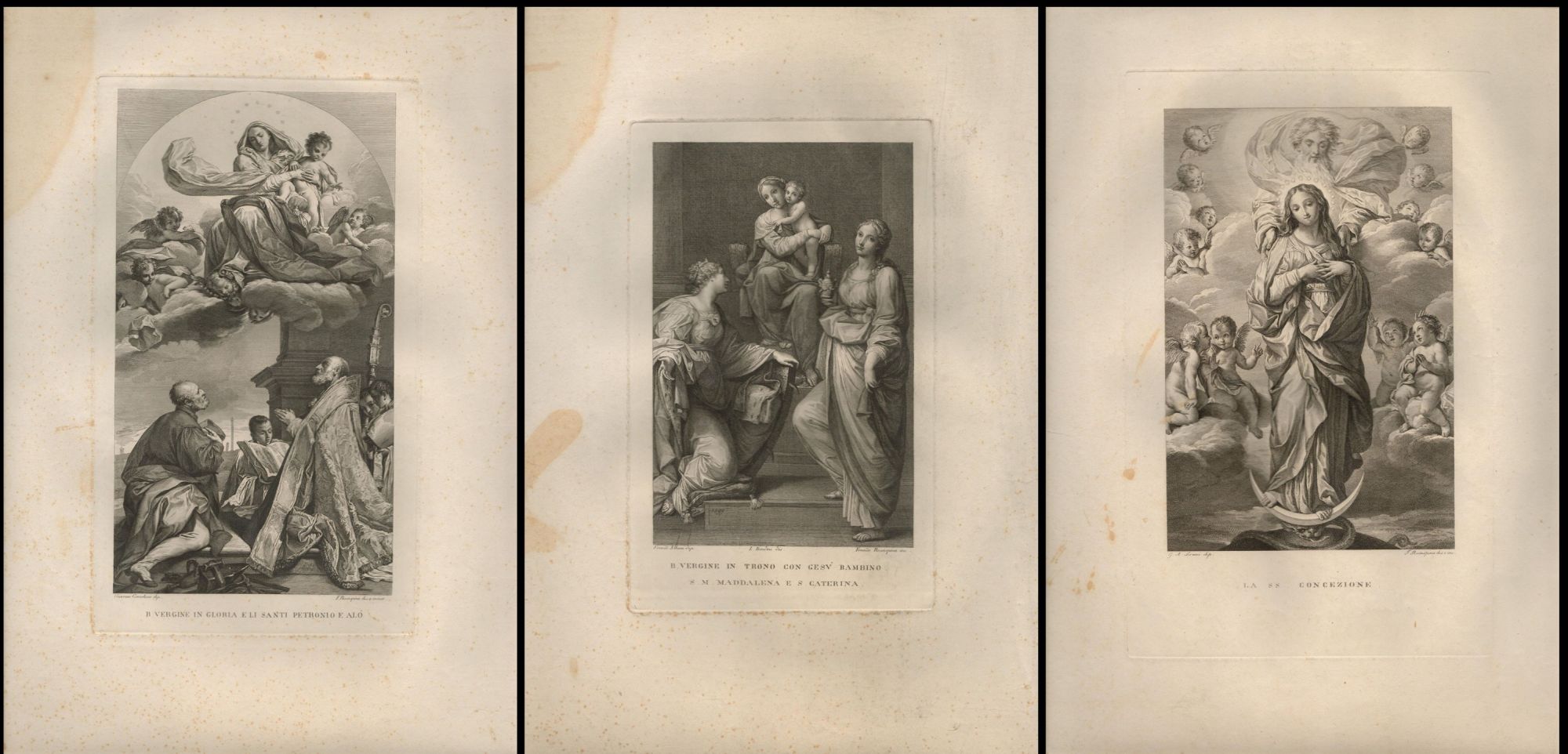bulino, 485 x 325 mm (cad. foglio), B. VERGINE IN GLORIA E LI SANTI PETRONIO E ALO da Giacomo Cavedone, LA SS. CONCEZIONE da Giovanni Andrea Sirani, B. VERGINE IN TRONO CON GESU BAMBINO S. M. MADDALENA E S. CATERINA da Francesco Albani. Stampate su carta non vergata. Fogli in buono stato, con segni di fioritura, lieve macchie e qualche sgualaciatura