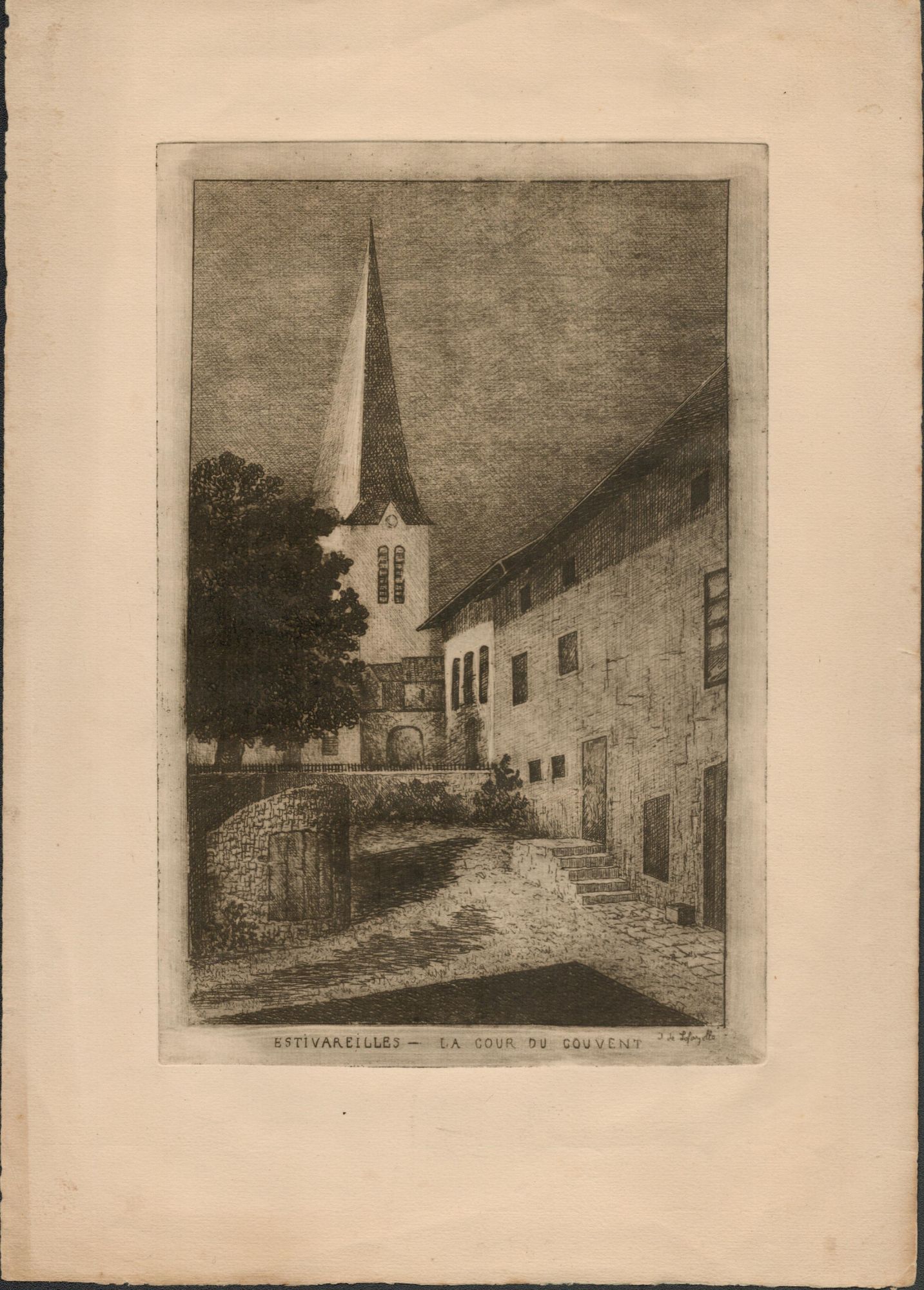 a) Estivareilles - La Cour du Couvent. Acquaforte, 256 x 168 mm (lastra); 356 x 252 mm (foglio).. Firmata in lastra in basso a destra. Fresca impressione su carta vergellata moderna con filigrana. Foglio in buono stato.