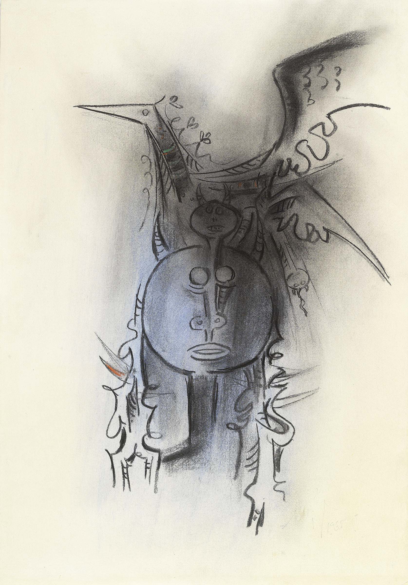 Wifredo Lam Sagua La Grande 1902 - Parigi 1982 Totem, 1965 Pastello e carboncino su carta, cm. 70x49,5 Firma e data in basso a destra: Wi / 1965; al verso: dedica Per Giordano / Wi Lam 1975; su un cartone di supporto: etichetta Mary-Anne Martin Fine Art, New York, con n. LAMWDR1965001. Certificato su foto di Lou Laurin Lam, Parigi, 26-11-2001.