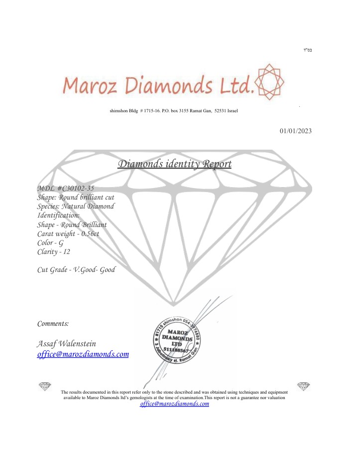 DIAMANTE NATURAL POLISHED 0,56 CARATI COLORE G - PUREZZA I2 - TAGLIO BRILLANTE - CERTIFICATO GEMMOLOGICO MAROZ DIAMONDS LTD MEMBRO ISRAEL DIAMOND EXCHANGE - C30102-35