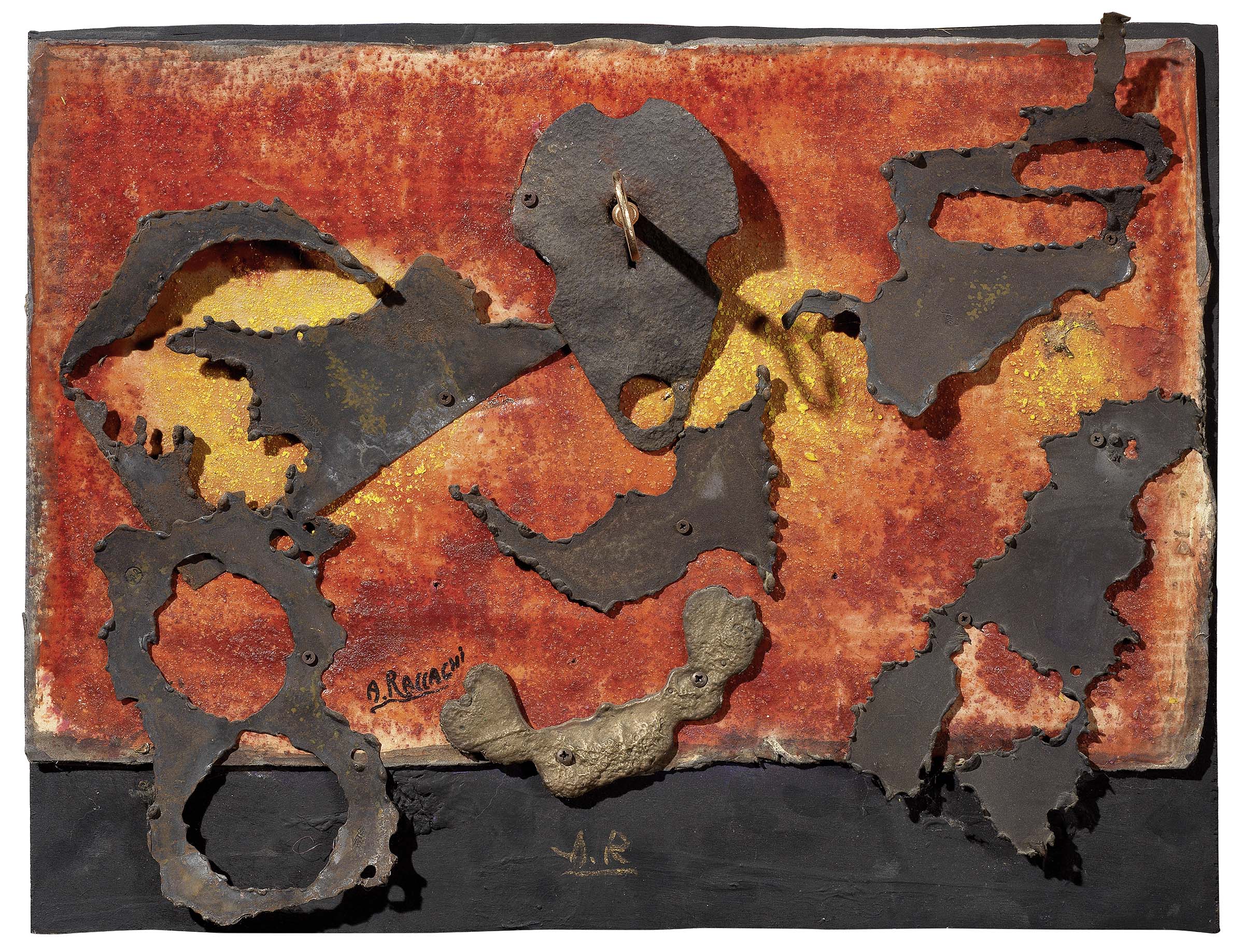 Andrea Raccagni Imola (Bo) 1921 - 2005 La chiave d'oro, 1960 Tecnica mista su tavola, cm. 40x53 Firma e sigla in basso: A. Raccagni / A.R; al verso titolo, firma, data e scritta: La chiave d'oro / A. Raccagni / 1960 / del il mio studio al ex convento / delle Donzelle / Imola. Bibliografia: Andrea Raccagni. La Sintesi degli Opposti 1945-2005, a cura di Gabriele Boni, Christian Maretti Editore, Faenza, 2006, p. 209.