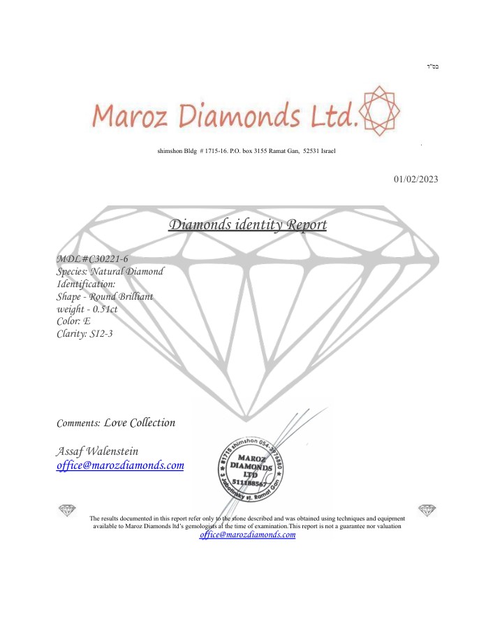 DIAMANTE NATURAL POLISHED 0,51 CARATI COLORE E - PUREZZA SI3 - TAGLIO BRILLANTE - PUREZZA INCISO AL LASER - CERTIFICATO GEMMOLOGICO MAROZ DIAMONDS LTD MEMBRO ISRAEL DIAMOND EXCHANGE - C30221-6