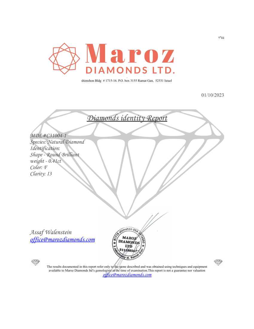 DIAMANTE 0,41 CARATI COLORE F - PUREZZA I3 - TAGLIO BRILLANTE - CERTIFICATO GEMMOLOGICO MAROZ DIAMONDS LTD MEMBRO ISRAEL DIAMOND EXCHANGE - C31004-1