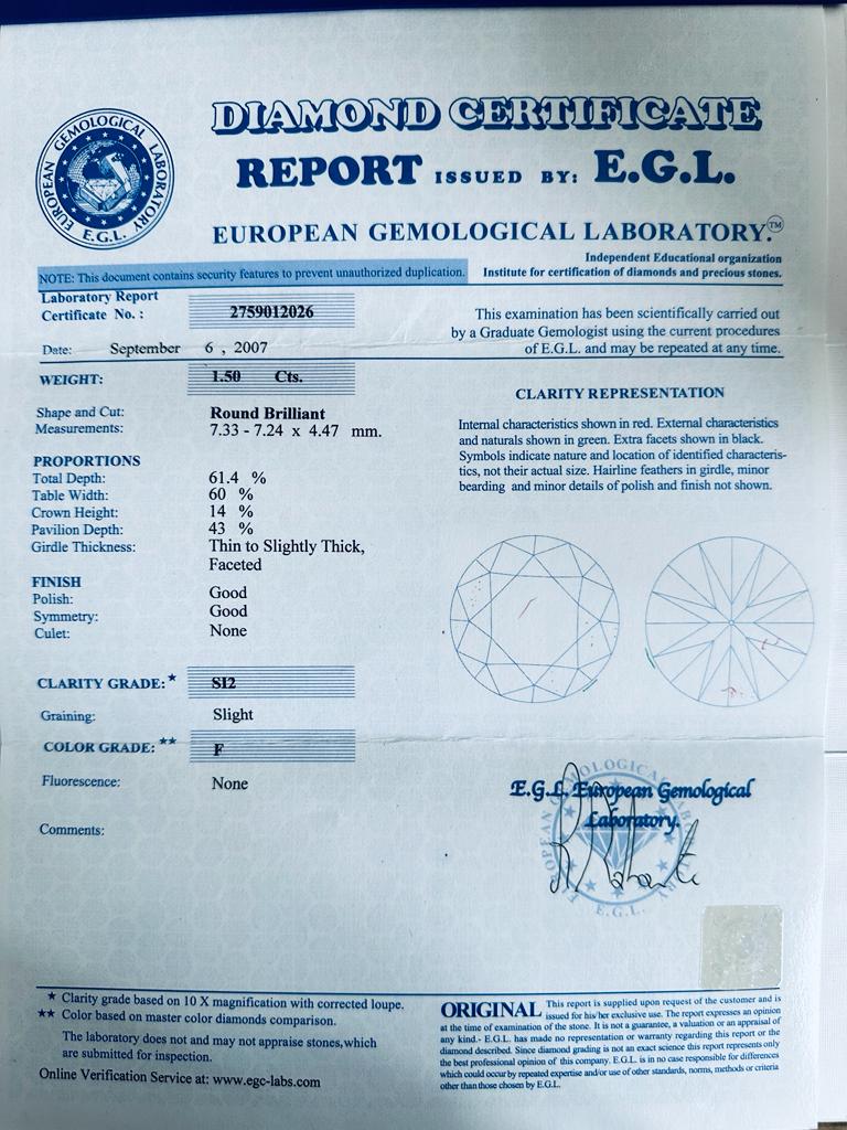 DIAMANTE NATURAL POLISHED 1,51 CARATI COLORE F - PUREZZA SI2 - TAGLIO BRILLANTE - CERTIFICATO EGL - DH30113