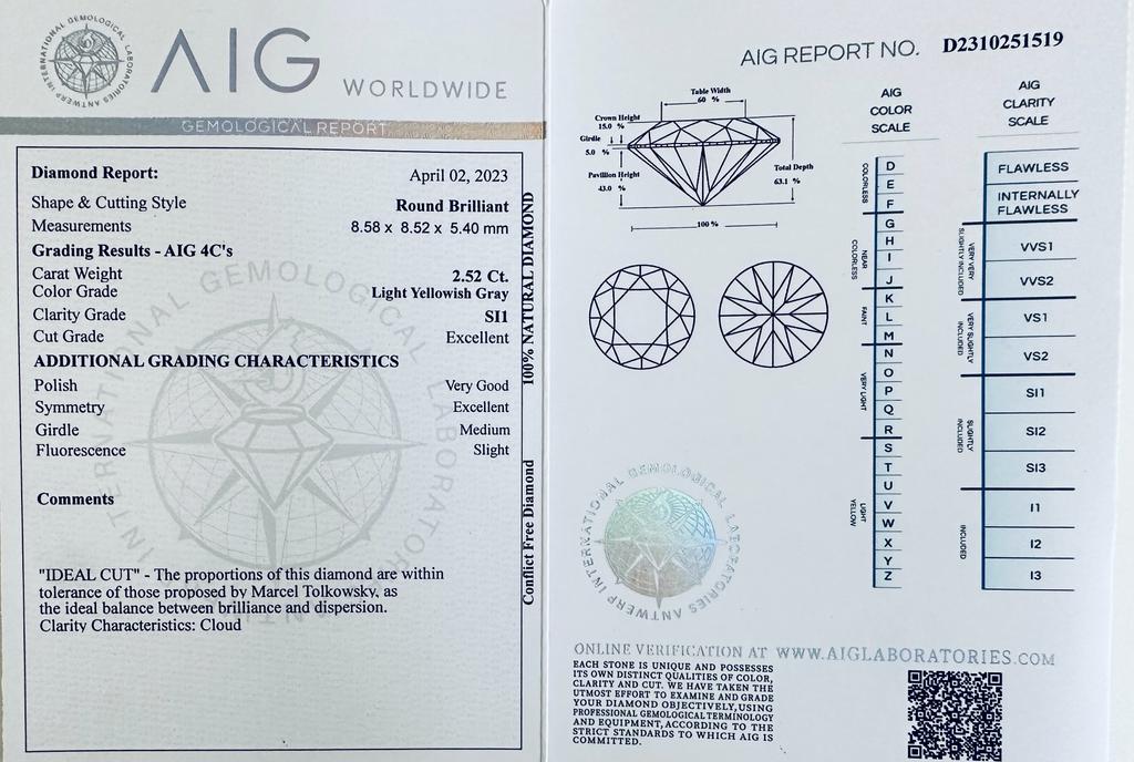 DIAMANTE 2,52 CARATI COLORE COLORE GIALLO CHIARO GRIGIASTRO - PUREZZA SI1 - TAGLIO BRILLANTE - C30311-1