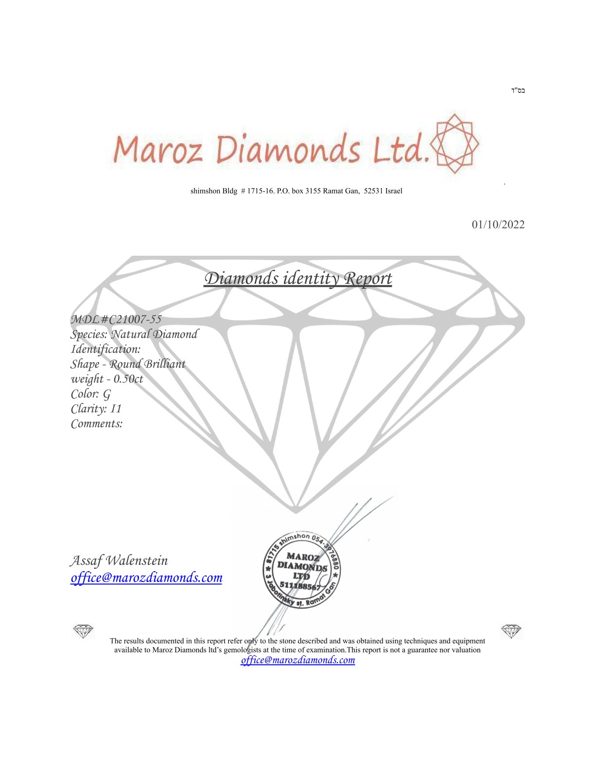 DIAMANTE NATURAL POLISHED 0,5 CARATI COLORE G - PUREZZA I1 - TAGLIO BRILLANTE - CERTIFICATO GEMMOLOGICO MAROZ DIAMONDS LTD MEMBRO ISRAEL DIAMOND EXCHANGE - C21007-55