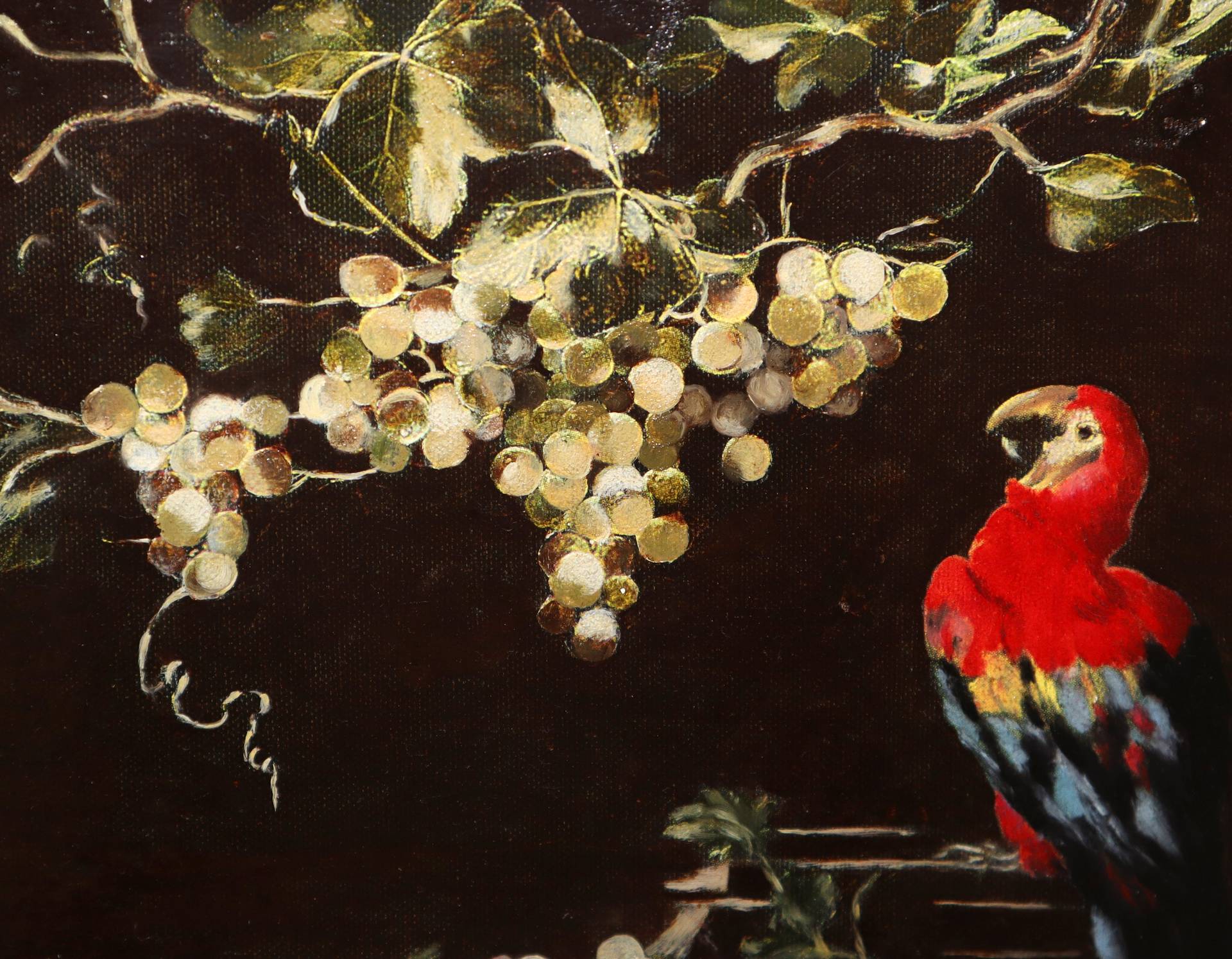 Natura morta di frutta con pappagallo H cm 40x30 - in cornice H cm 54x44 Olio su tela Firmato con monogramma in basso a sinistra KC