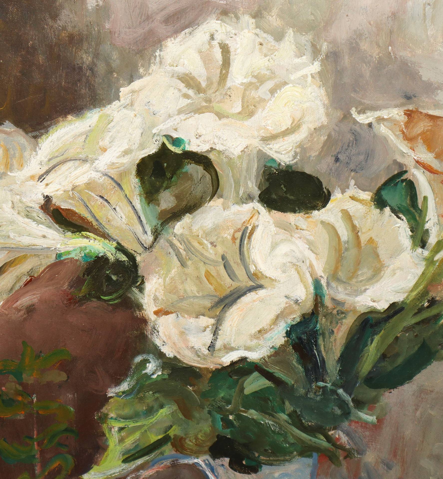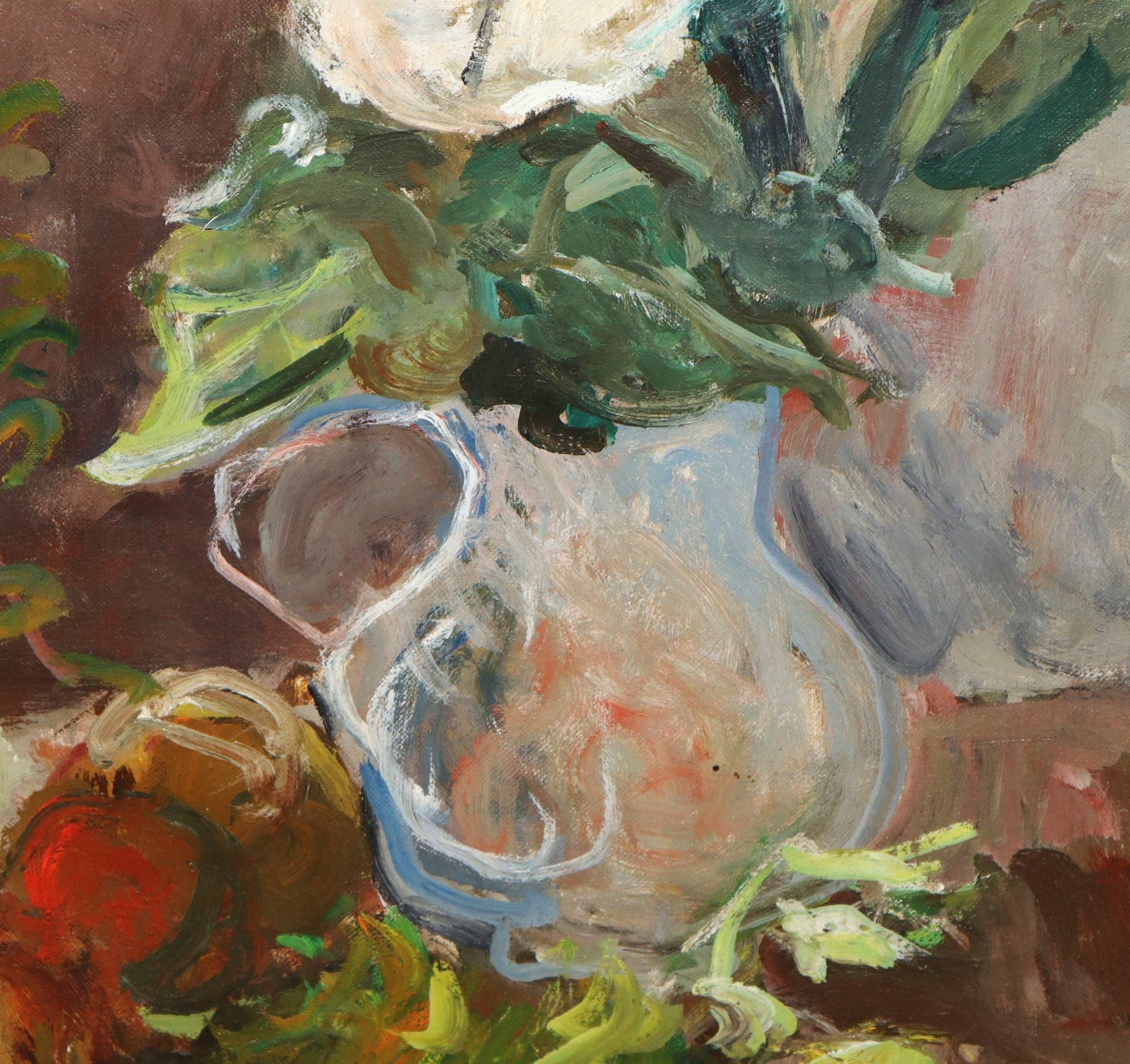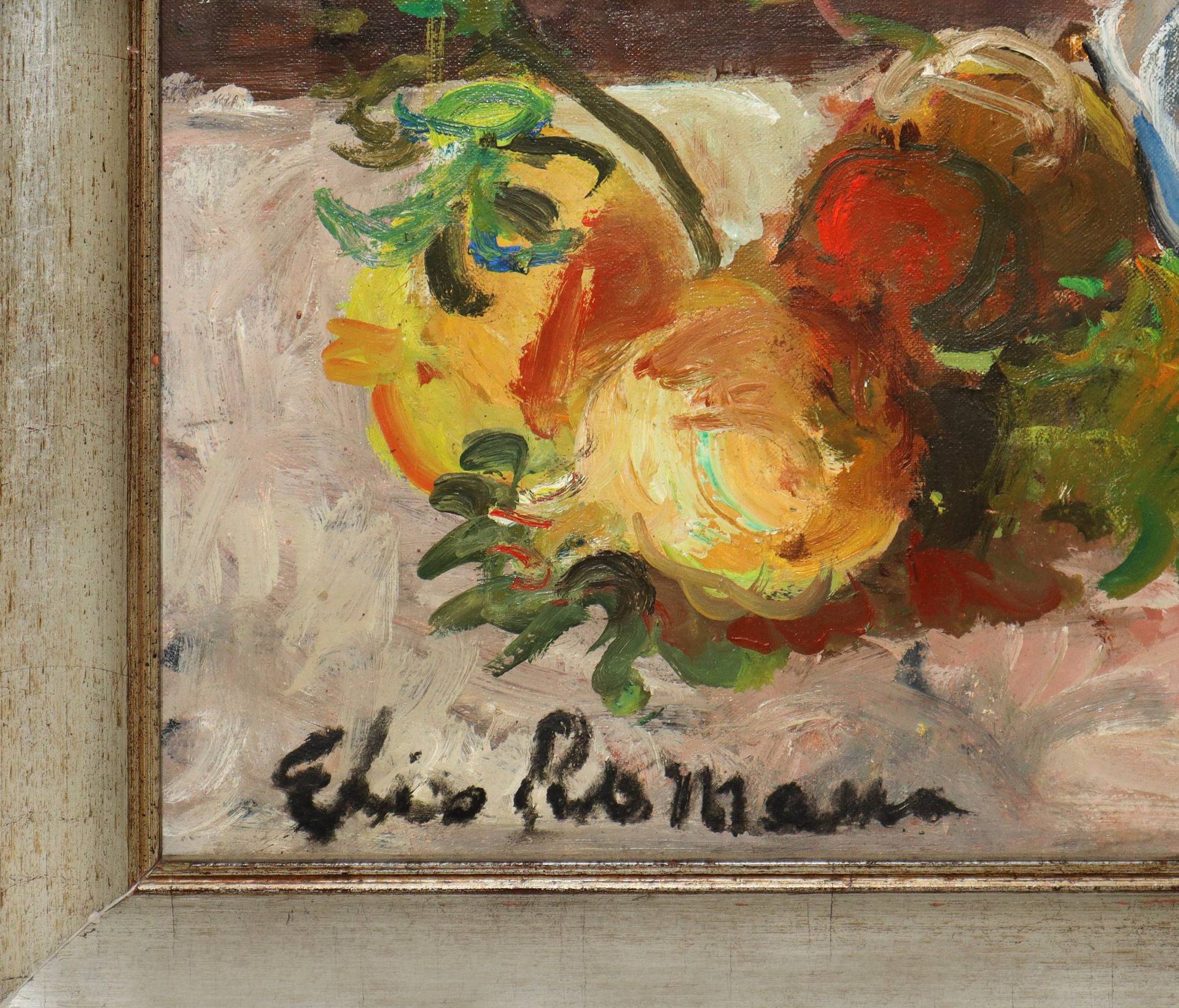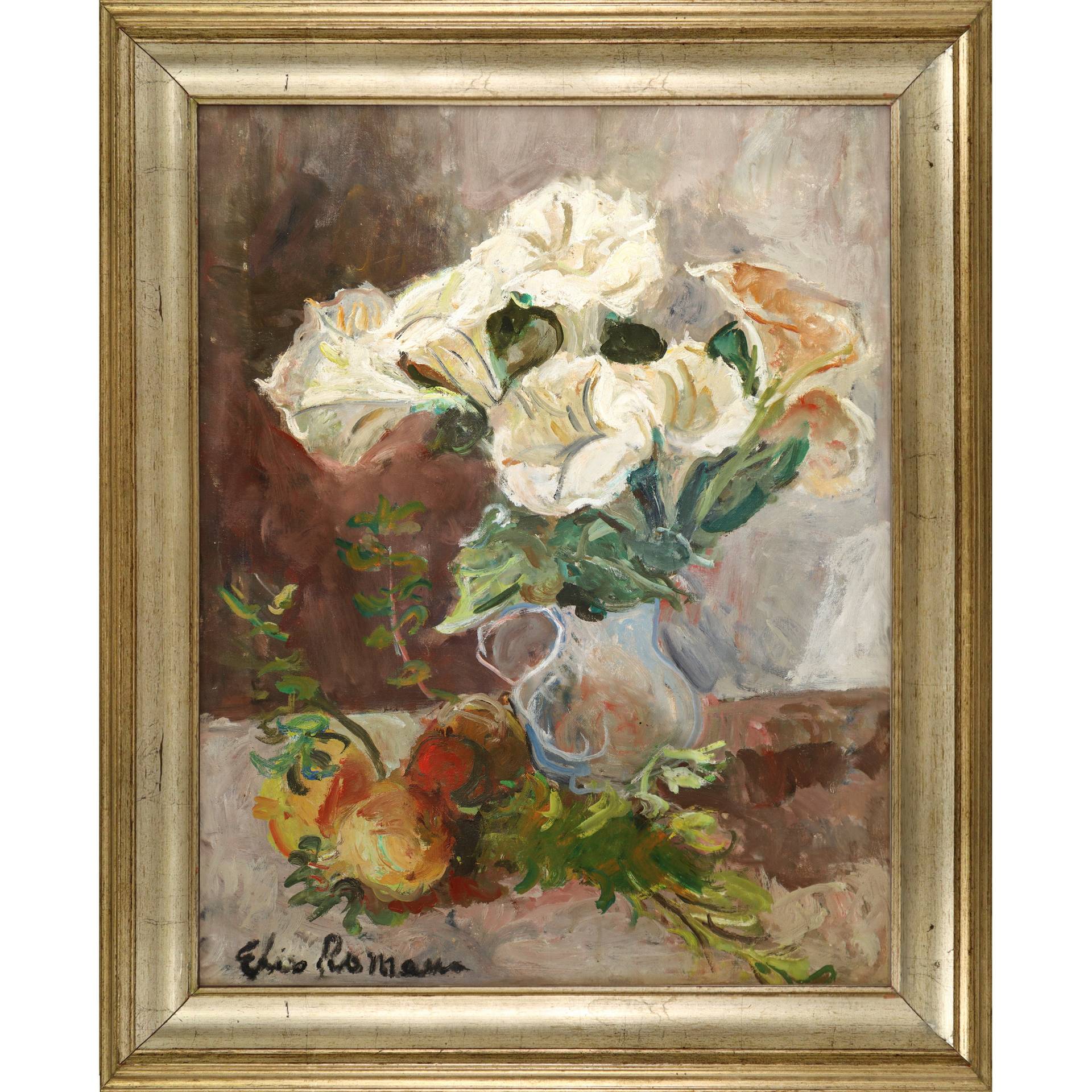 Elio Romano (Trapani 1909-Catania 1996) - Vaso con fiori e frutti 64x49 in cornice cm 80x63 Olio su tela Firmato sul fronte in basso a sinistra. Autentica su foto del figlio Guido Romano