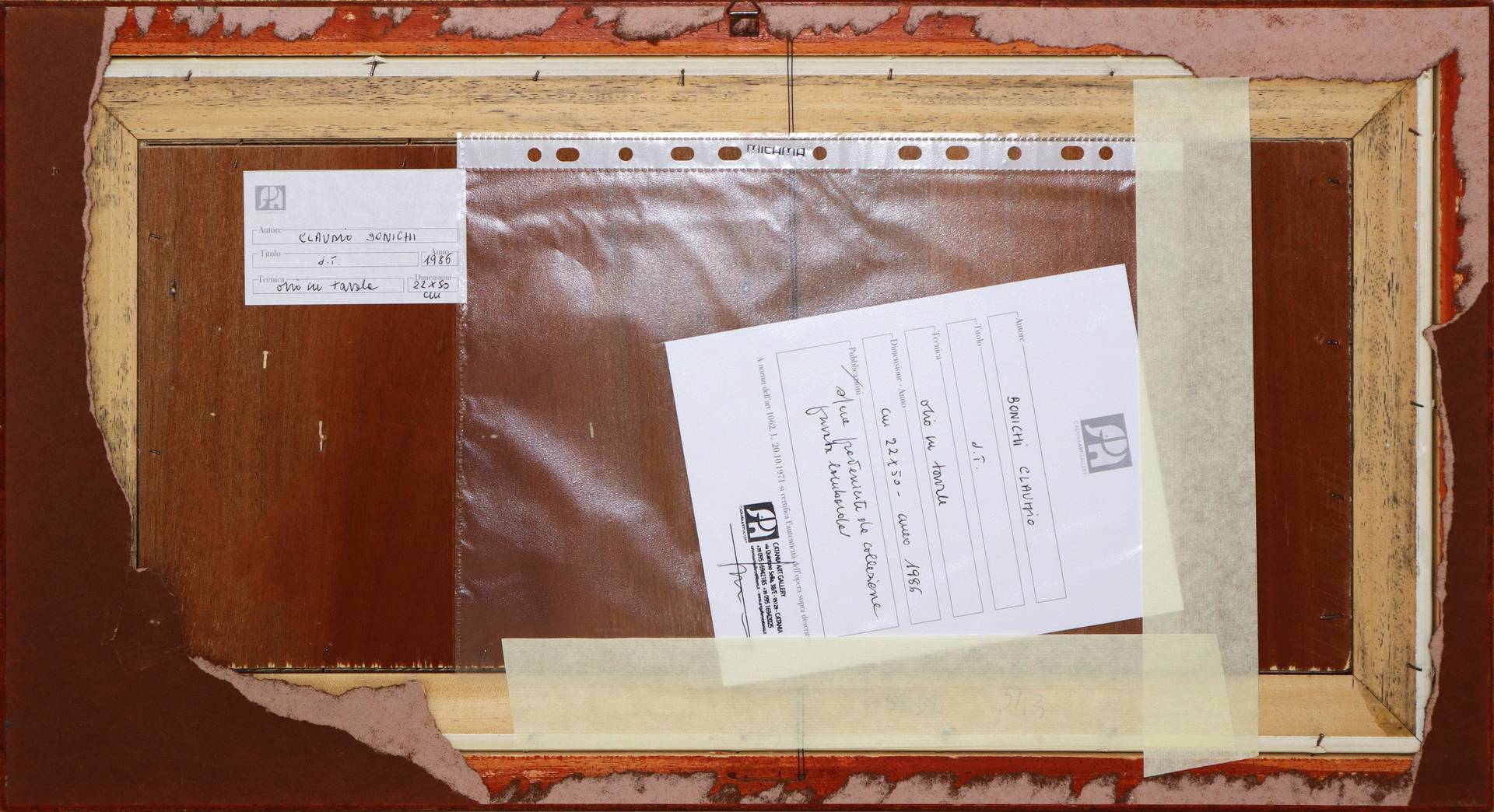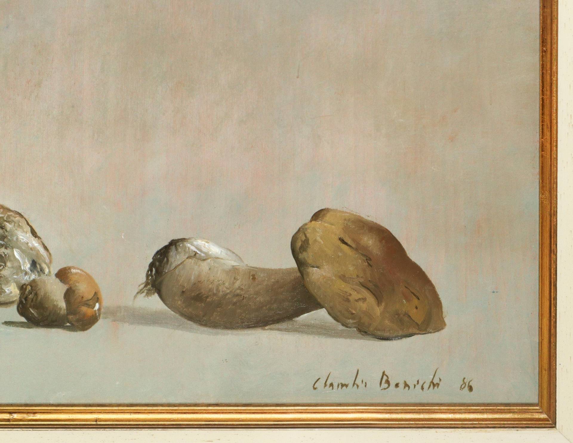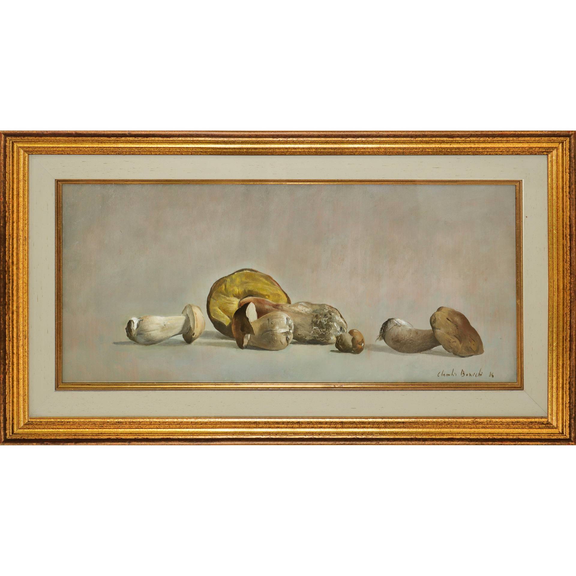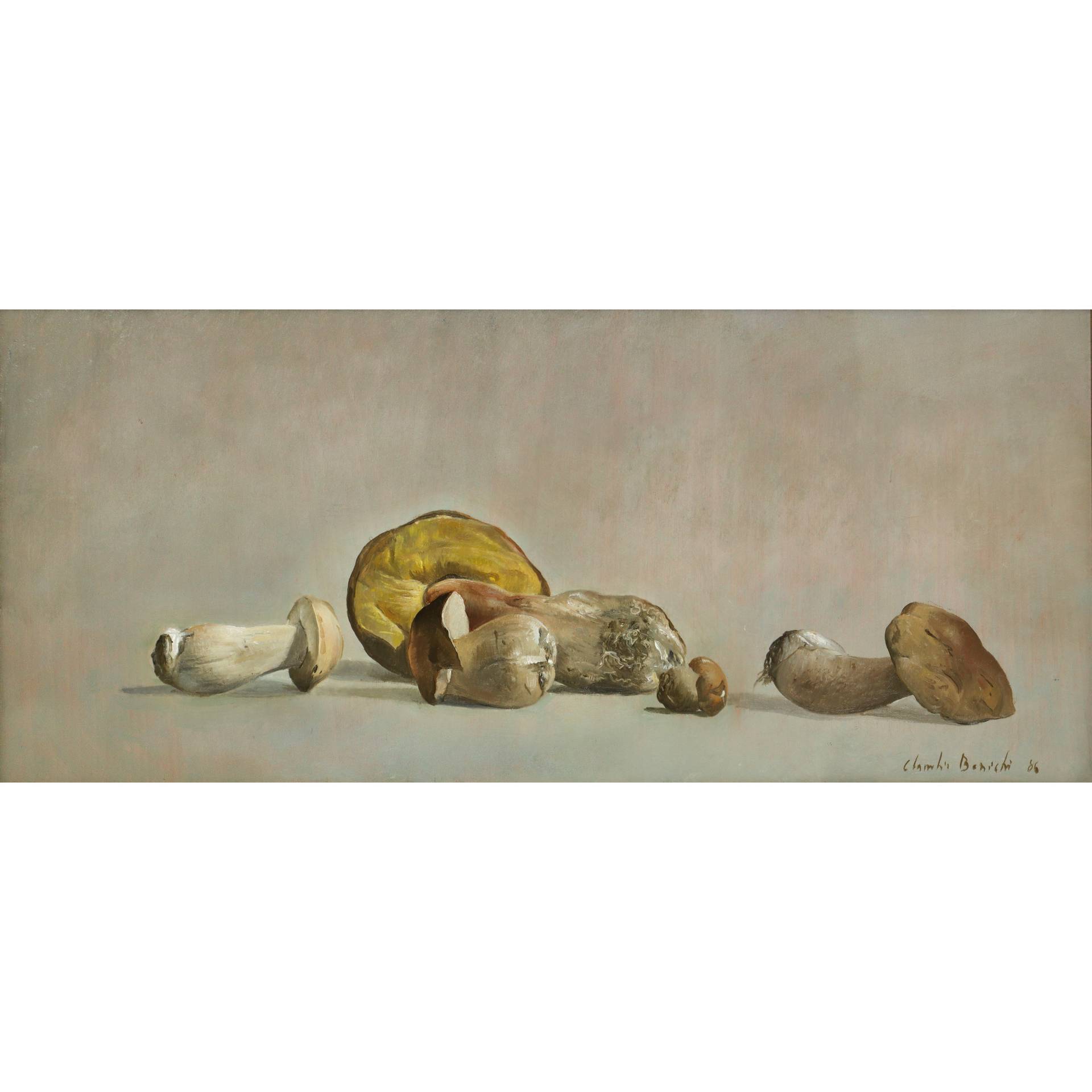 Claudio Bonichi (Novi Ligure 01/06/1943-2016) - Funghi, 1986 22.5x50.5 - in cornice cm 34x64 Olio su tavola Firma e data sul fronte in basso a destra. Autentica su fotografia