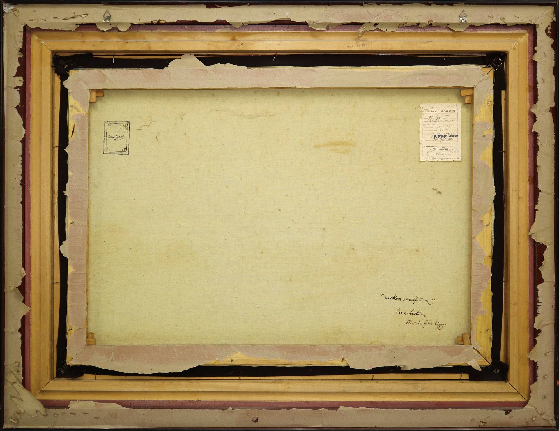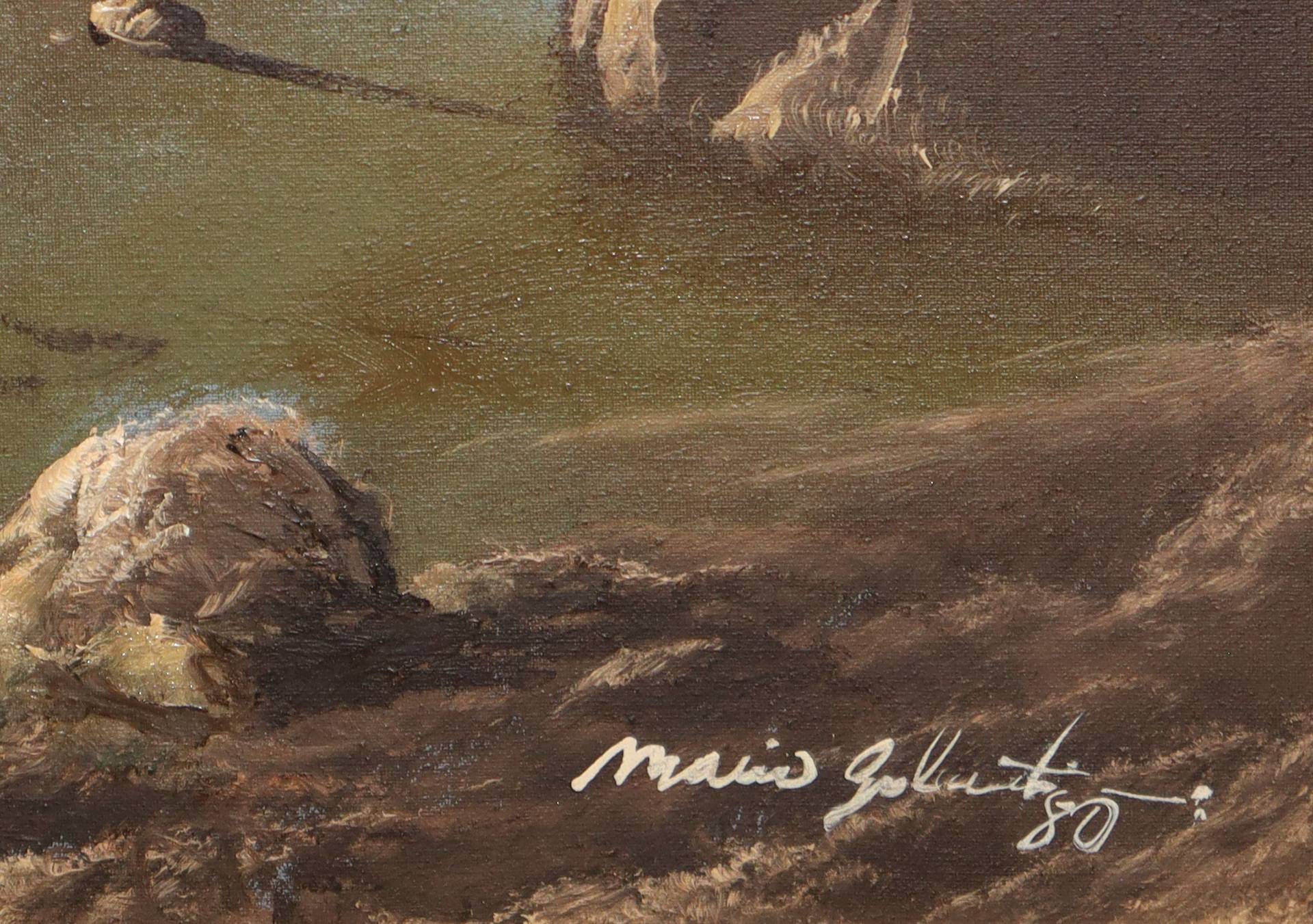 Mario Galanti - Costiera amalfitana (marina con barche e pescatori) H cm 70x105 - in cornice H cm 102x130 Olio su tela Firmato in basso a destra e sul retro titolato Costiera amalfitana e firmato. Eyichetta Centro Arte Moderna.