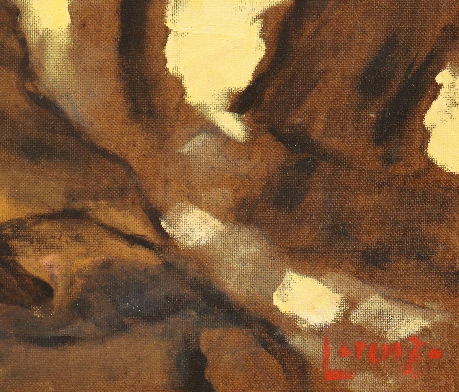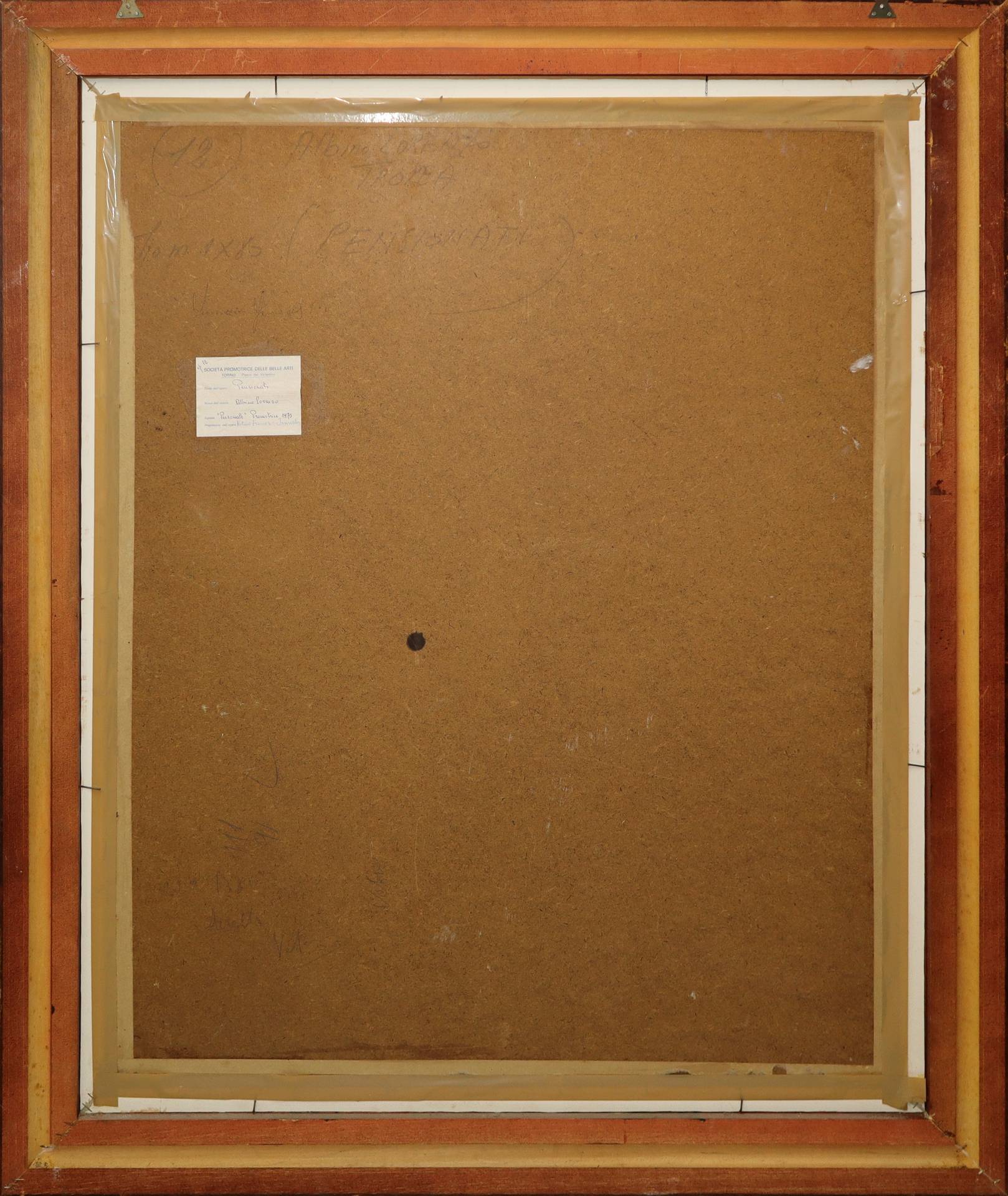 Lorenzo Albino (Tropea 1922-2005) - Uomini seduti, "Pensionati" H cm 104x85 - in cornice H cm 121,5x101 Olio su faesite Firmato in basso a destra. Al retro Etichetta Societa' promotrice delle Belle Arti, Torino - Parco del Velentino con titolo, nome dell'autore, esposta "Personale" Promotrice 1975, proprieteario dell'opera. Al retro scritte a matita.