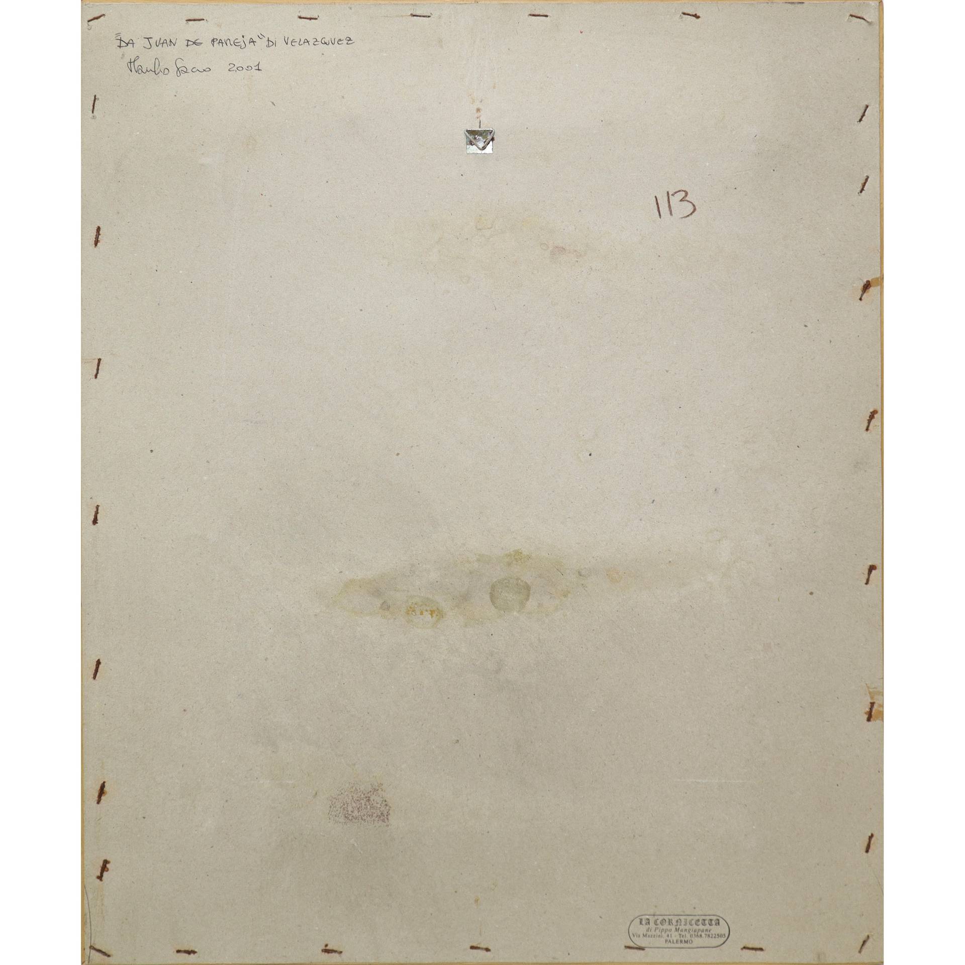 Manlio Sacco (Palermo 1978) - Da Juan di Paneja da Velasquez, 2001 cm 40x30, in cornice cm 54x44 Olio su tela Firmato in basso a destra. Sul retro titolato, firmato e datato. Sul retro Timbro Galleria La Cornicetta , Palermo