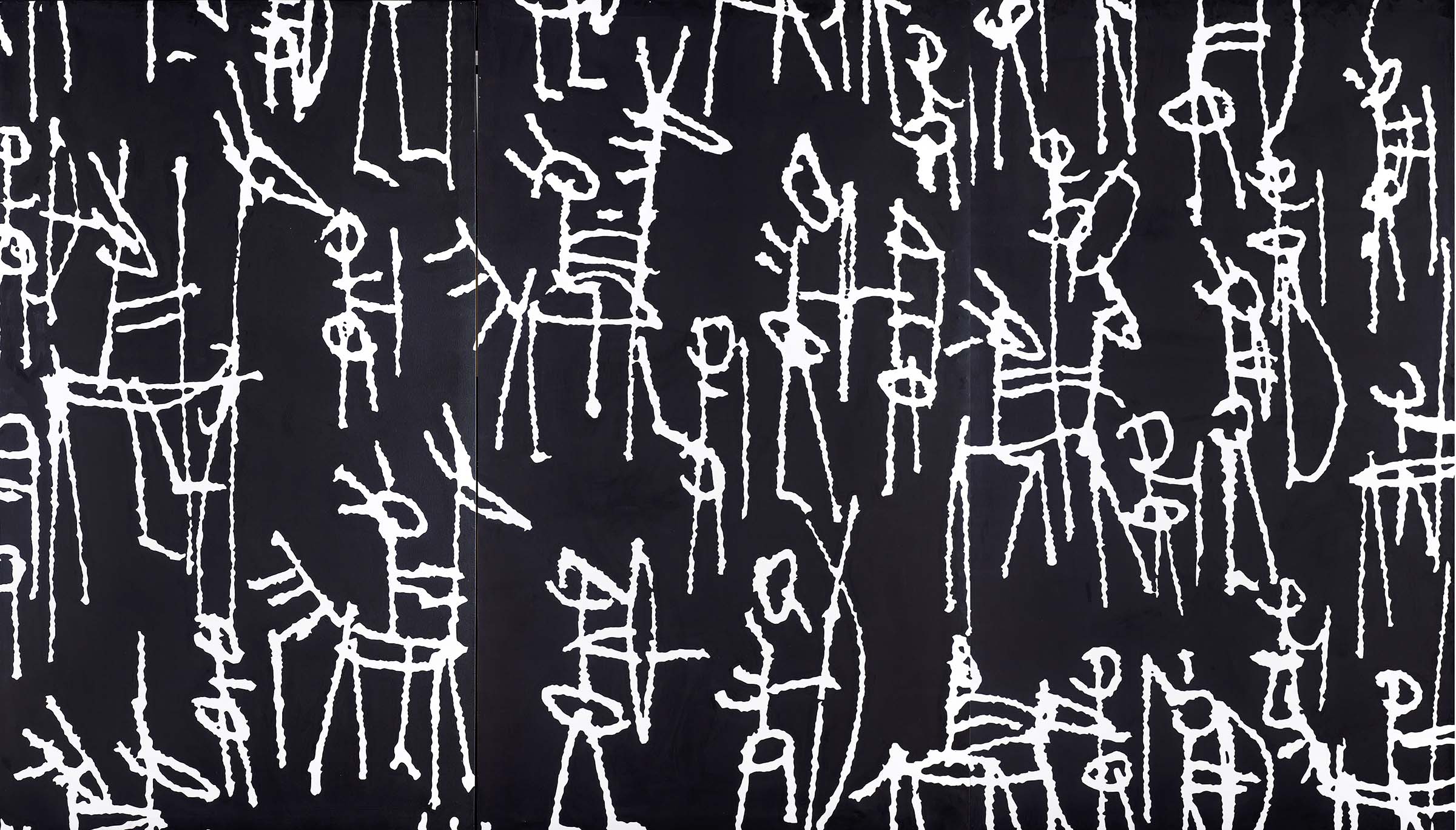 Sergio Fermariello Napoli 1961 Guerrieri, 1993 Olio su tela, trittico, cm. 340x600 (tre elementi di cm. 340x200 ognuno) Firma e data al verso sulla tela di ogni elemento: Sergio Fermariello / 1993; sul telaio di ogni elemento: etichetta La Biennale di Venezia, 1993, con dati dell'opera. Opera pubblicata sul sito www.sergiofermariello.com, all'anno 1993. Esposizioni: XVL Esposizione Internazionale d'Arte, Venezia, 1993, cat. pp. 72, 73, 74, n. 1.