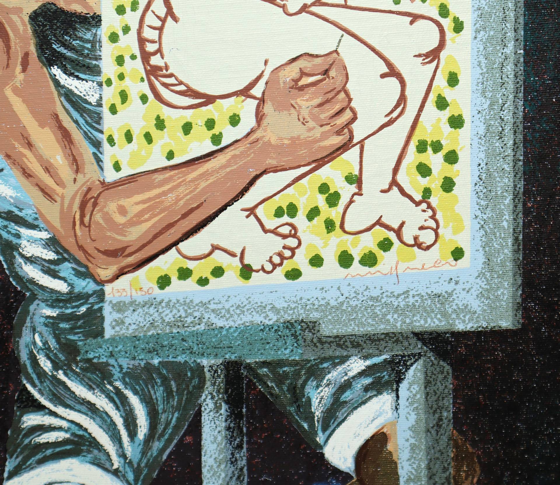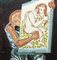 Giuseppe Migneco (Messina 1903-Milano 1997) - Uomo con quadro di donna H cm 65x45 - in cornice H cm 85x65 litografia colorata a mano su tela