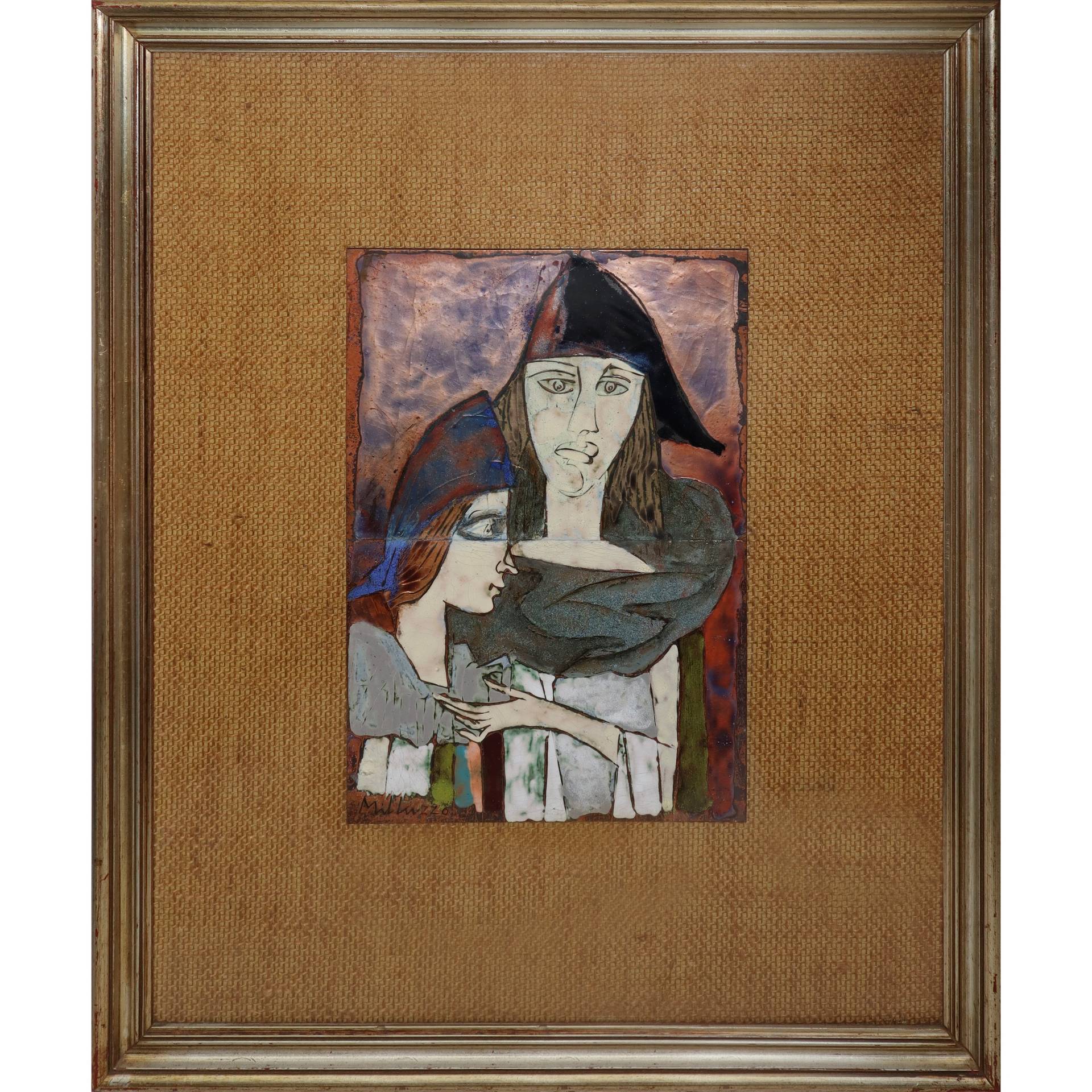 Sebastiano Milluzzo (Catania 1915-Catania 2011) - Coppia di donne cm 32,5x22,5, in cornice cm 62x51 Smalto su rame Firmato in basso a sinistra