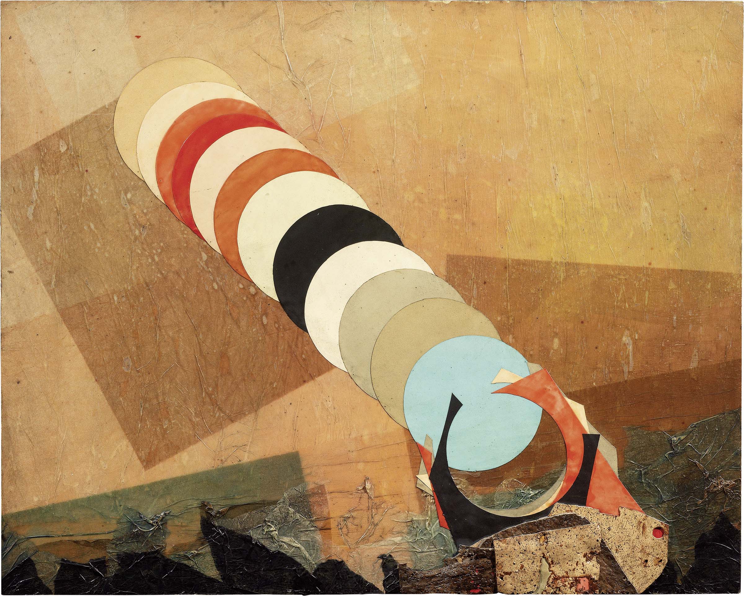 Roberto Crippa Milano 1921 - Bresso (Mi) 1972 Nascita del sole, 1971 Collage su tavola, cm. 130,5x162,5 Firma, data, titolo e dedica al verso: R. Crippa '71 / "Nascita del sole" / per Giraldi Livorno: timbro Saletta Viviani, Pisa: due sigle Bruno Giraldi. Certificato su foto Saletta Viviani, Pisa.