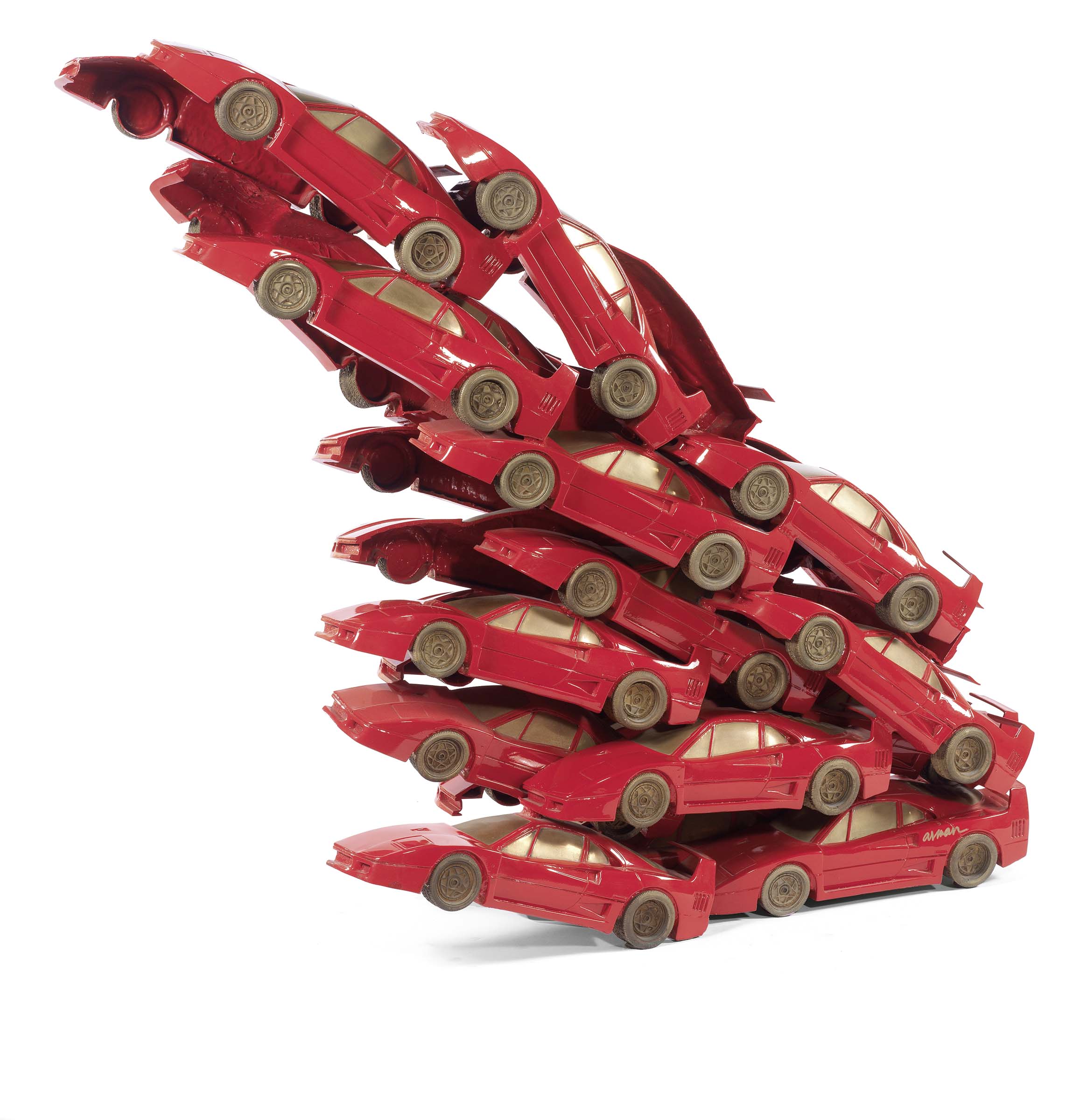Arman Nizza 1928 - 2005 Rampante, (1999) Accumulazione di modellini Ferrari F40 in bronzo dipinto, es. 2/8, cm. 123 h. Firma su un lato: Arman; sull'altro lato tiratura: 2/8: marchio Bocquel Fondeur. Vendita per conto del Tribunale di Livorno.