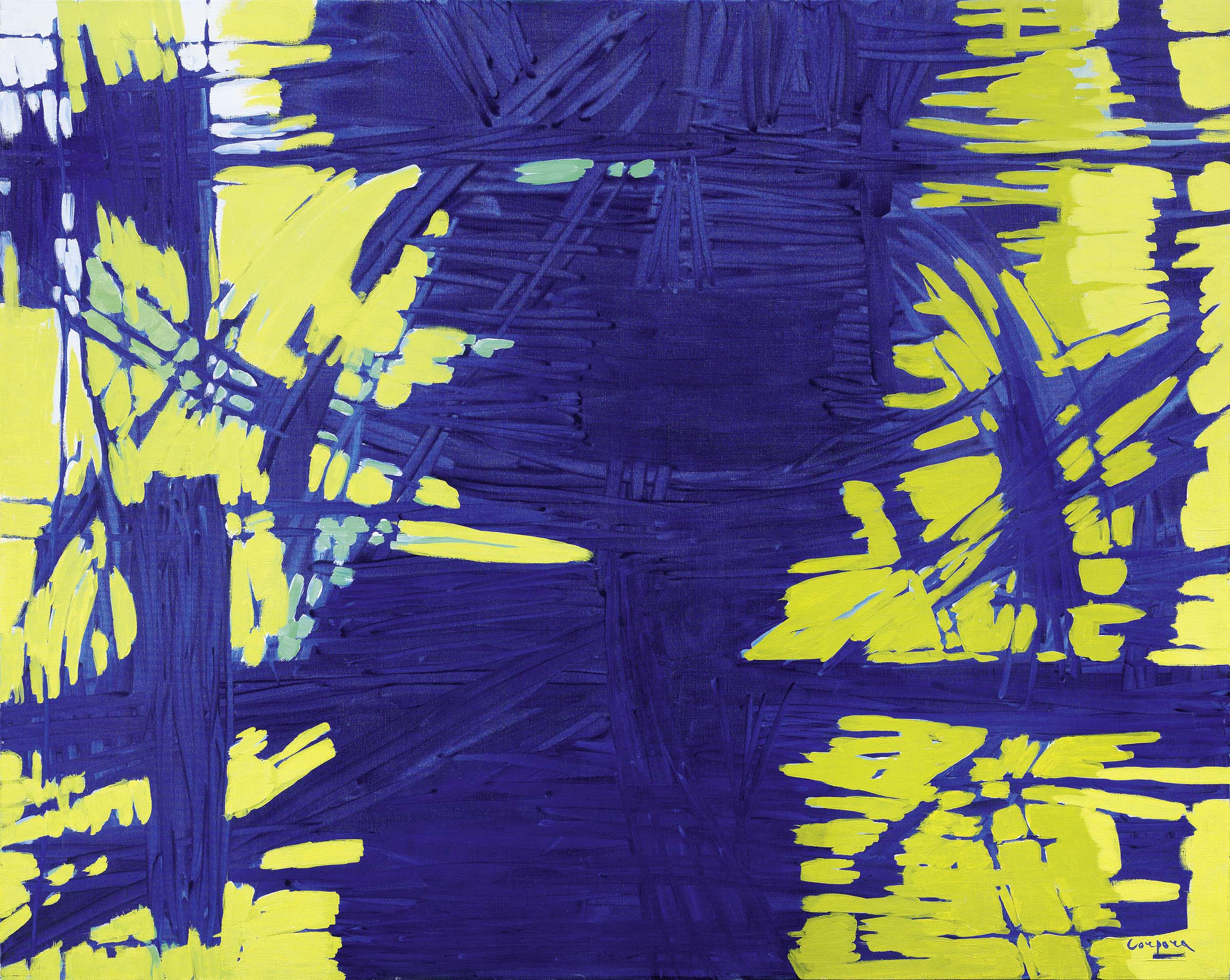 Antonio Corpora Tunisi 1909 - Roma 2004 Arcipelago, 1973 Olio su tela, cm. 130x161,5 Firma in basso a destra: Corpora; al verso sulla tela dedica, firma, titolo e data: Per Bruno Giraldi / Corpora / Arcipelago 1973: sigla Bruno Giraldi. Vendita per conto del Tribunale di Livorno.
