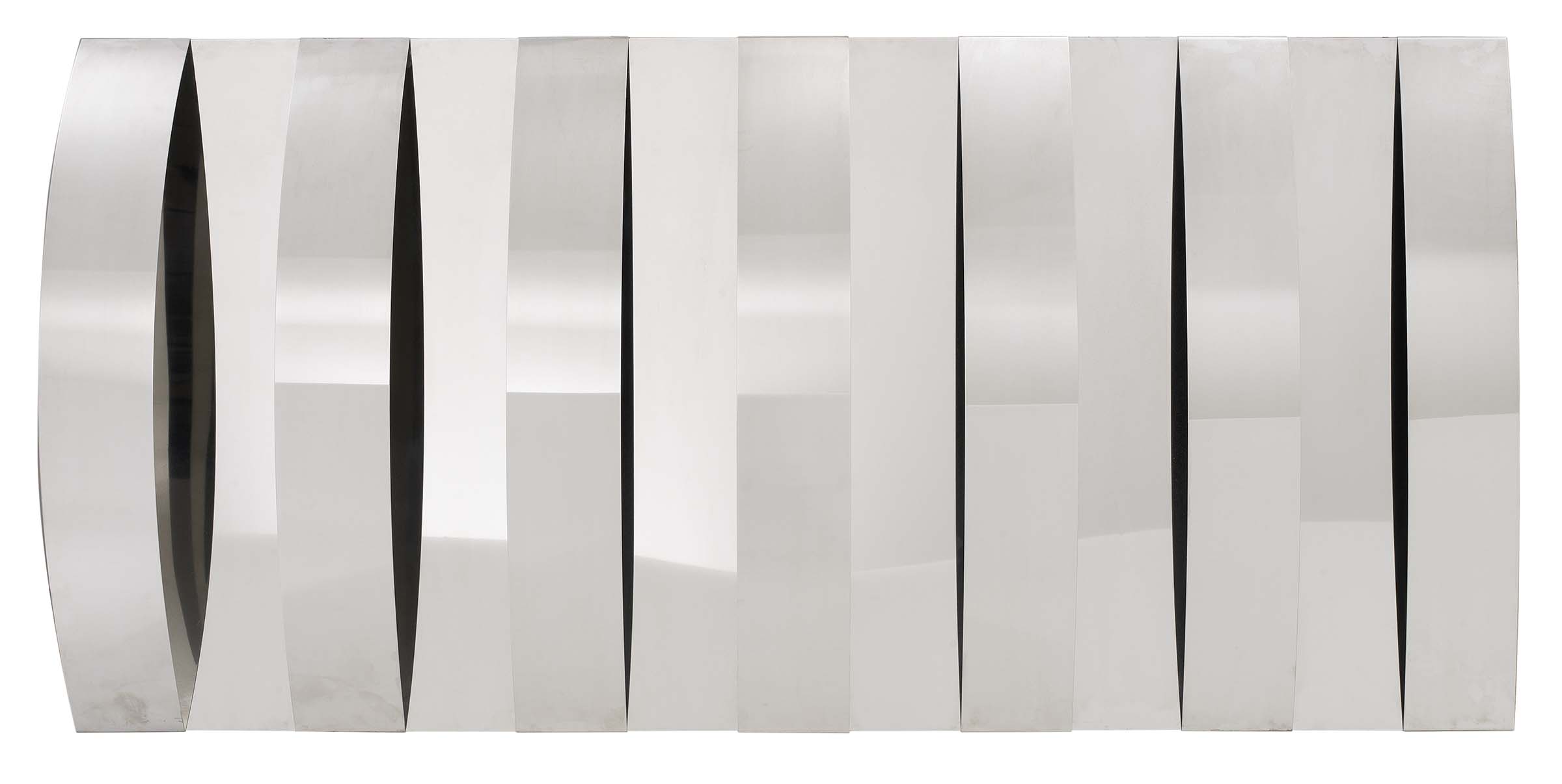Getulio Alviani Udine 1939 Rilievo speculare a elementi curvi, 1962 Acciaio, cm. 80x160x17 Firma, titolo e data incise al verso: Getulio Alviani / Rilievo a elementi curvi / 1962. Foto autenticata dall'artista. Esposizioni: Getulio Alviani ieri / oggi, Firenze, Galleria Santo Ficara, 7 ottobre - 11 novembre 2006.
