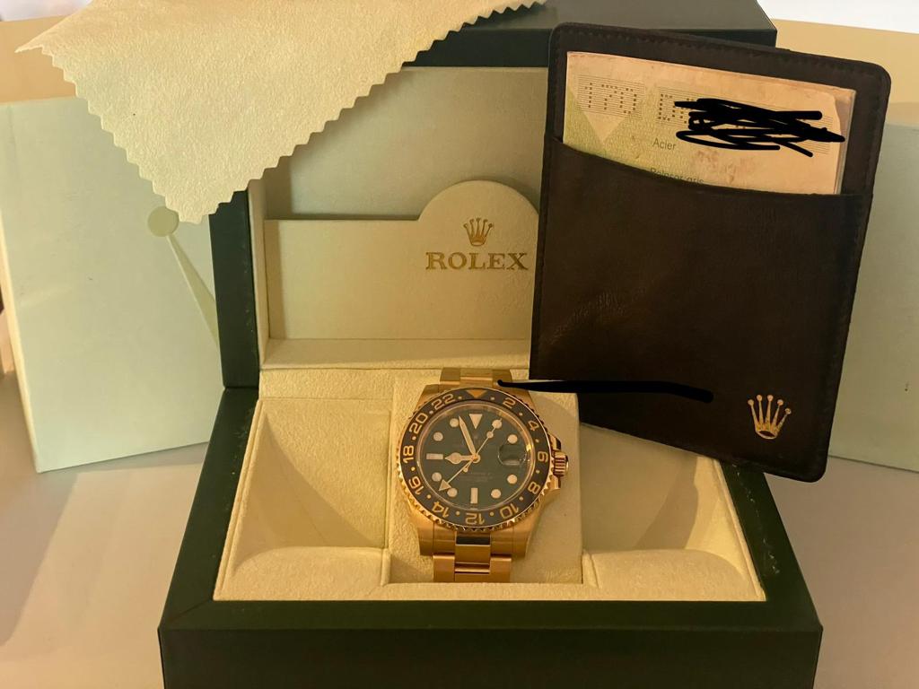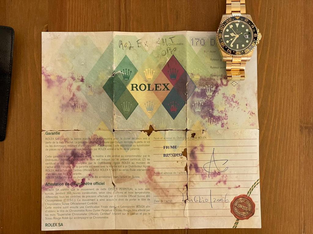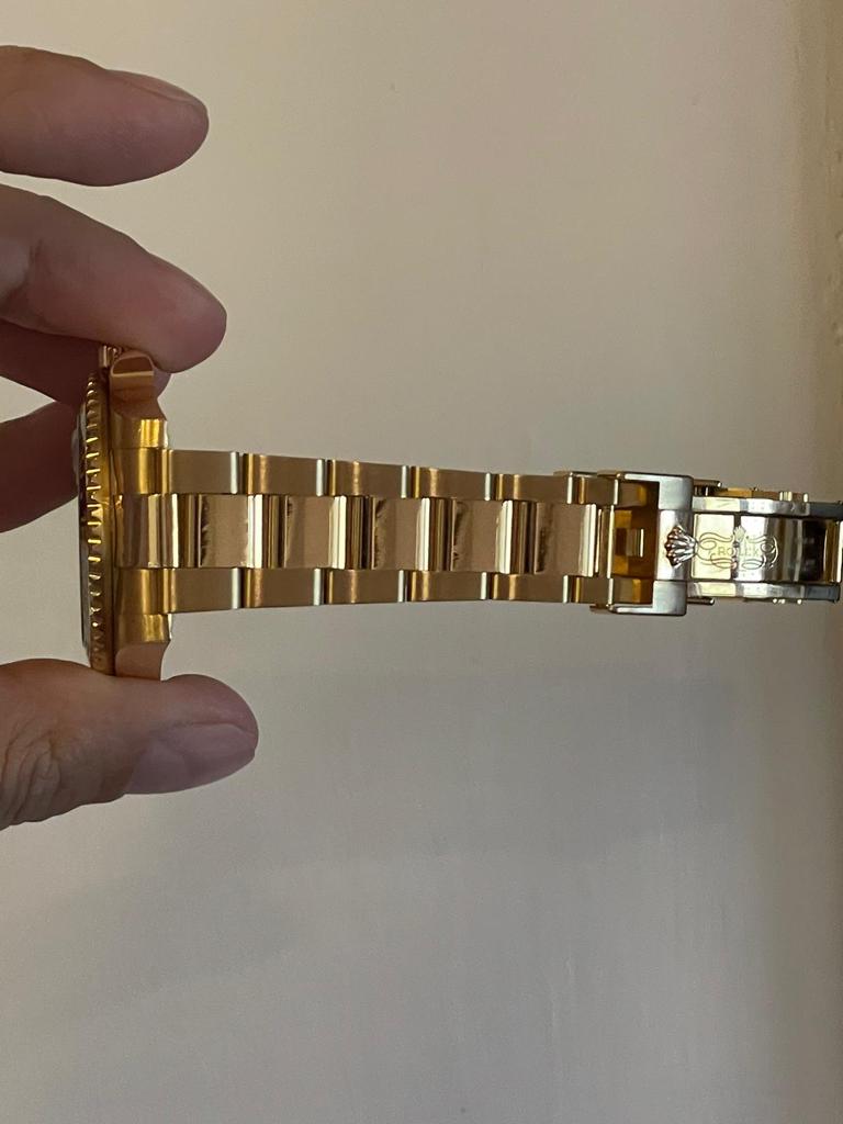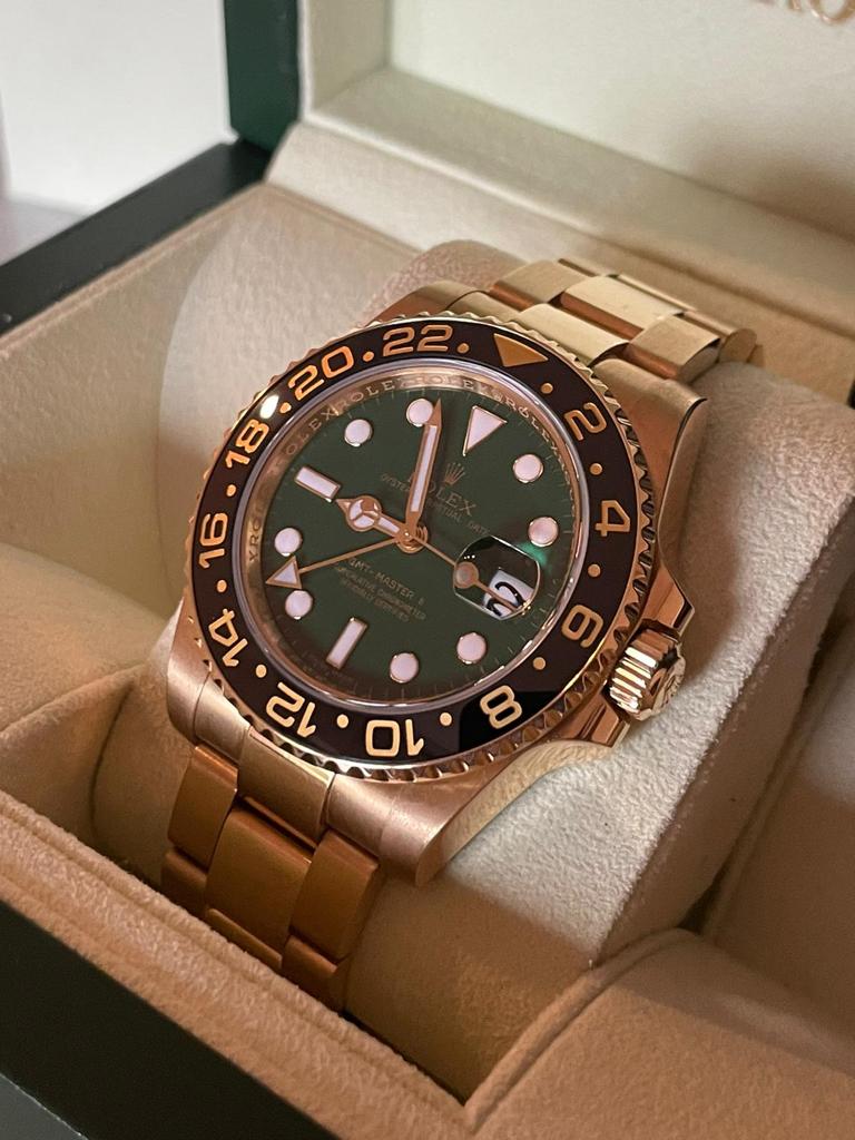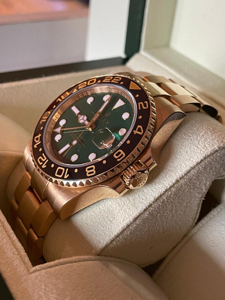 Marca Rolex Modello (Orologio) GMT-Master II Numero di referenza 116718LN Carica Automatico Materiale della cassa Oro giallo Materiale cinturino Oro giallo Anno di produzione 2005 Condizione Ottimo (di seconda mano, segni di usura assenti o appena visibili) Corredo documenti originali Rolex, no box, garanzia come da foto, 11maglie Calibro Carica Automatico Cassa Materiale della cassa Oro giallo Materiale lunetta Ceramica Vetro Vetro zaffiro Quadrante Verde Numeri sul quadrante Senza numeri Cinturino Materiale cinturino Oro giallo Colore cinturino Oro Chiusura Déployante Funzioni Data