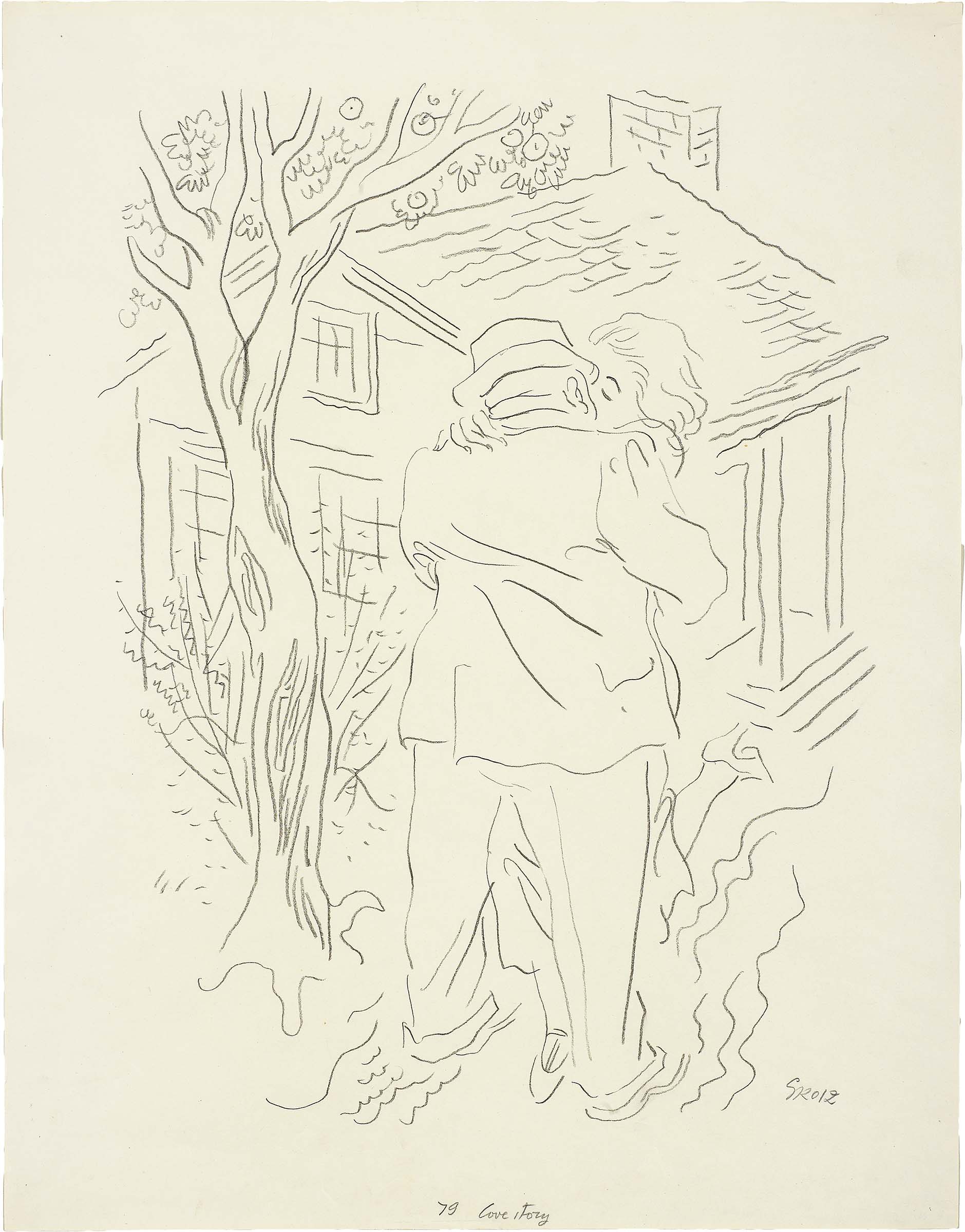 George Grosz Berlino 1893 - 1959 Love story, 1937 Matita su carta, cm. 59x46 Firma in basso a destra: Grosz, titolo in basso al centro: 79 Love story; al verso: timbro George Grosz Nachlass, con n. 4-241-5: scritta L1 Nr. 854 / Illustration für Esquire 1937. Storia: Eredità Grosz; Collezione Richard A. Cohn; Collezione privata Certificato di Richard A. Cohn, Estate of George Grosz, in data 1/15/87, con n. 4-241-5. Esposizioni: Sogni di carta. Dipinti, disegni e incisioni dei maestri del '900, Riccione, Galleria d'arte moderna e contemporanea Villa Franceschi, 25 giugno - 11 settembre 2011, cat. p. 58.