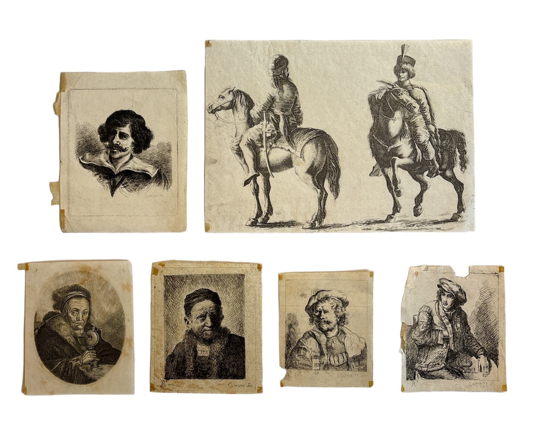 Di cui: 3 incisioni da Rembrandt ed una da Guercino. Sono incluse nel lotto 2 acqueforti di autori anonimi. Difetti alla carta.