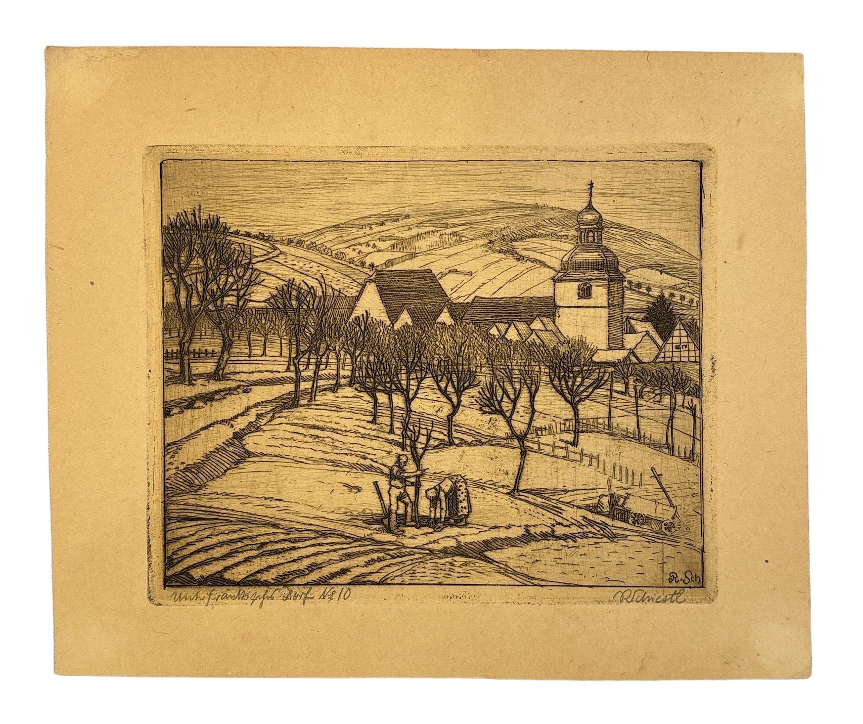 Rudolf Schiestl (1879 - 1931) Scorcio di paese con figure acquaforte su carta...