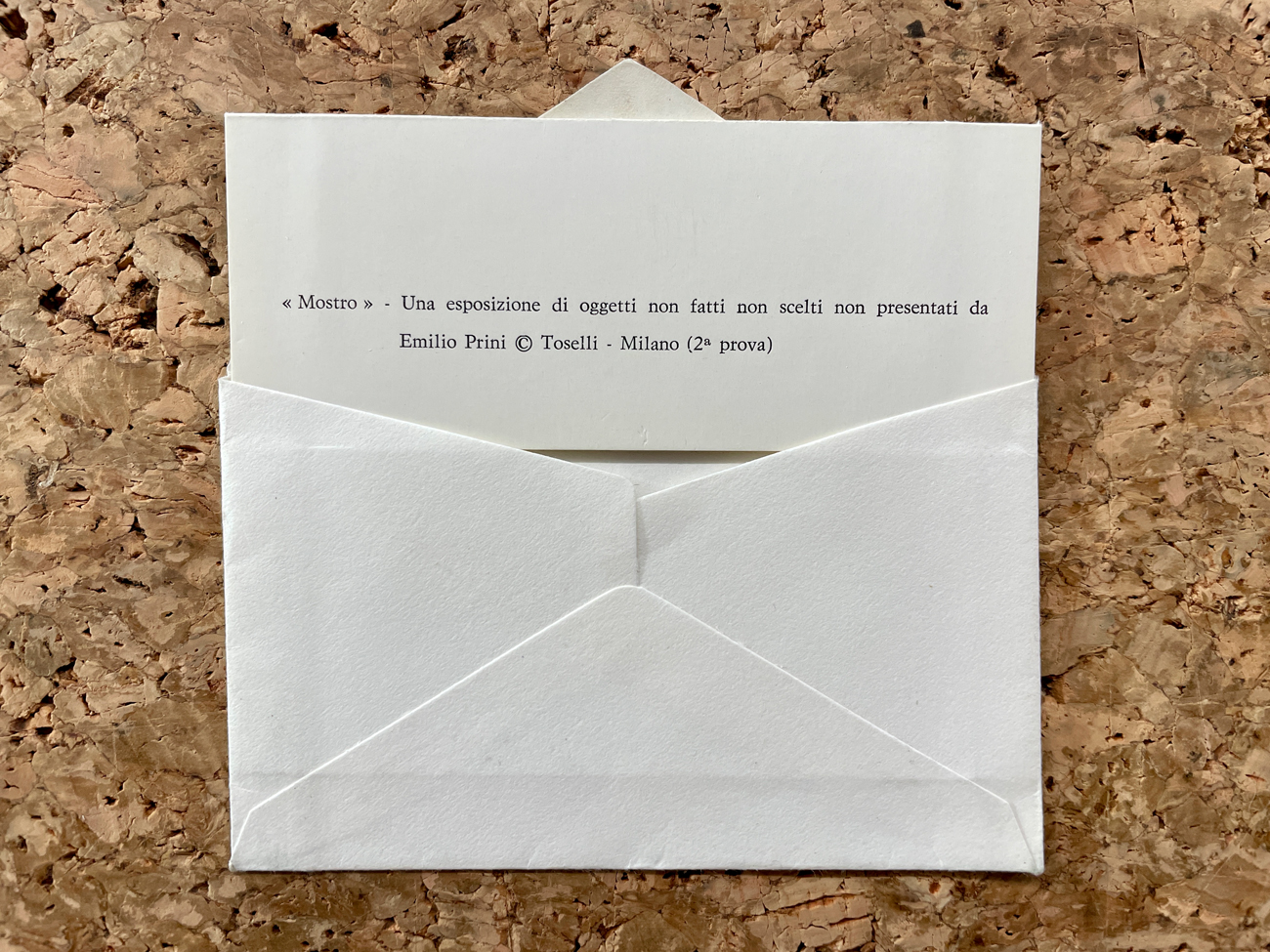 L'invito reca le indicazioni dell'esposizione e il titolo della stessa 'Mostro. Una selezione di oggetti non fatti non scelti non presentati da Emilio Prini' ed è contenuto all'interno di una busta intestata della Galleria Toselli