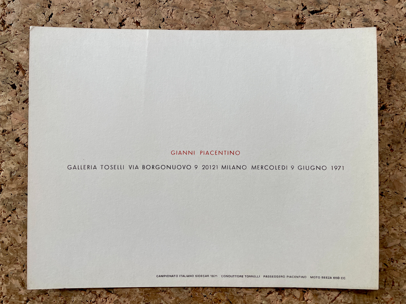 Invito su cartoncino all'esposizione di Gianni Piacentino tenutasi presso Galleria Toselli, Milano, 1971