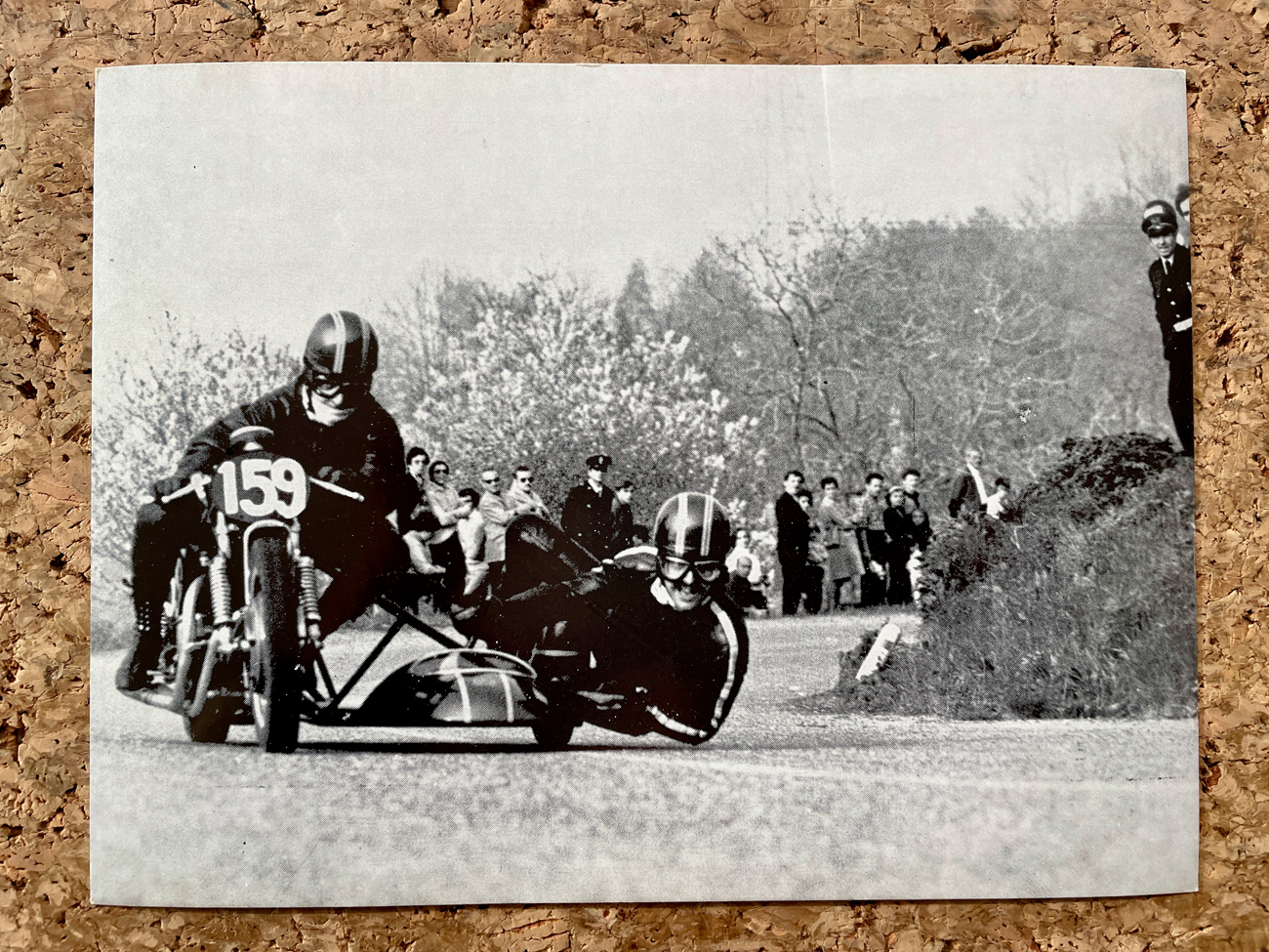 L'invito reca al fronte un'immagine in bianco e nero tratta dal 'Campionato italiano sidecar 1971' e ritraente il conduttore (Torelli) e il passeggero (Piacentino) su una Moto Beeza 650 cc e al retro le indicazioni del vernissage dell'esposizione