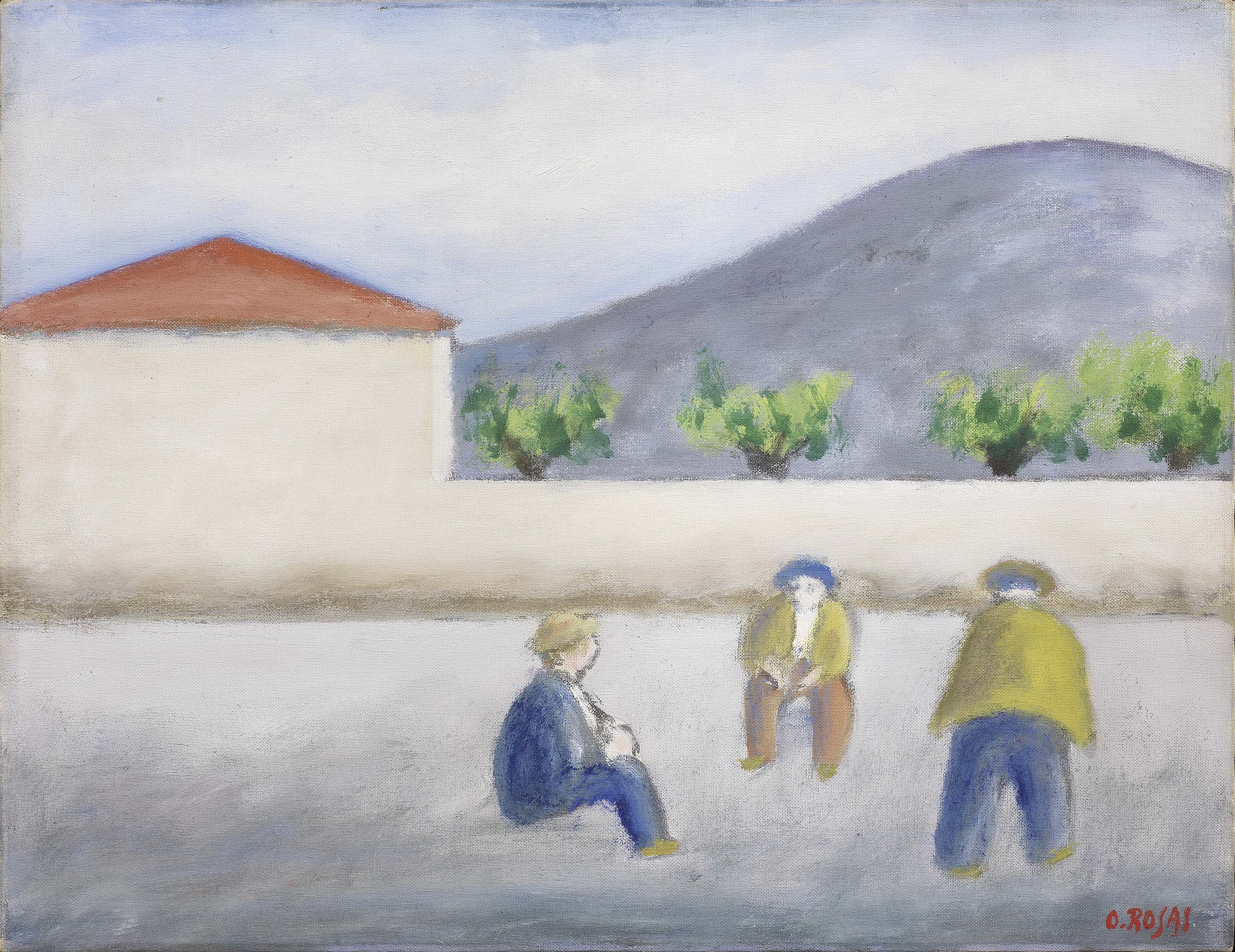 Ottone Rosai Firenze 1895 - Ivrea (To) 1957 Tre uomini e il monte, 1955 ca. Olio su tela, cm. 50x65,5 Firma in basso a destra: O. Rosai. Al verso sulla tela: etichetta e due timbri Galleria d'Arte Santacroce, Firenze, con n. 130: etichetta Galleria La Bussola, Torino, con n. 70142. Certificato su foto di Luigi Cavallo, Milano, 20 novembre 2000.