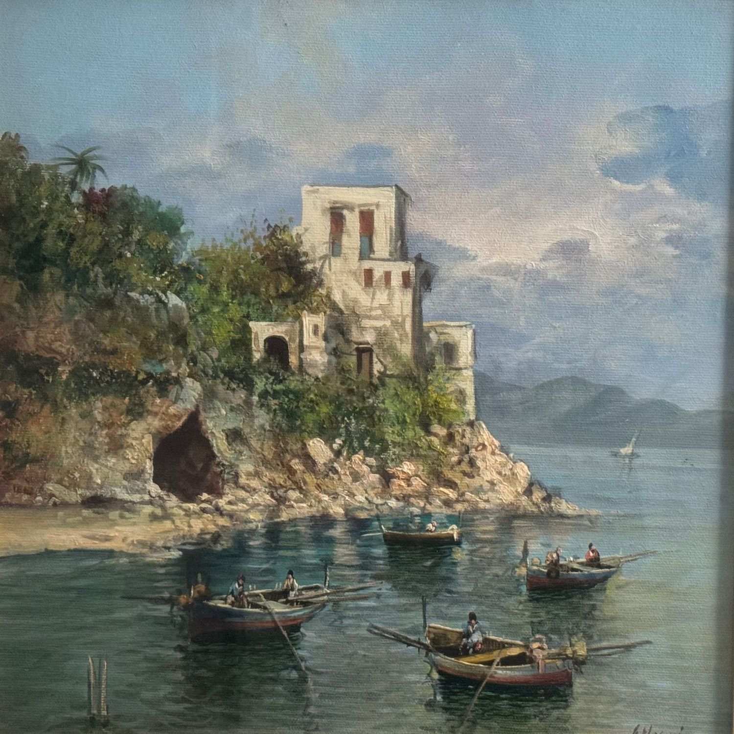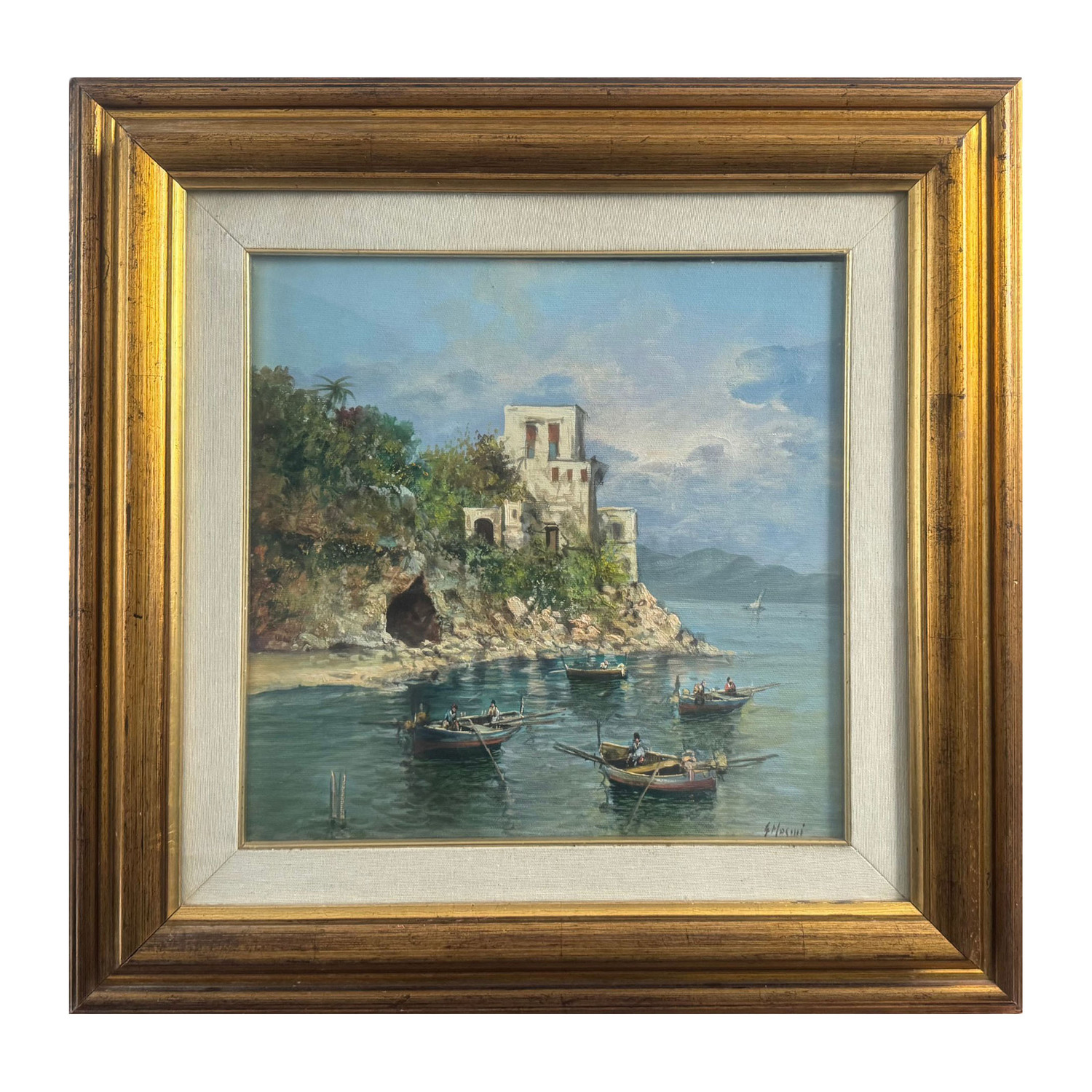 Dipinto olio su tela, periodo XX secolo scuola Italiana raffigurante Scorcio di marina con barche.