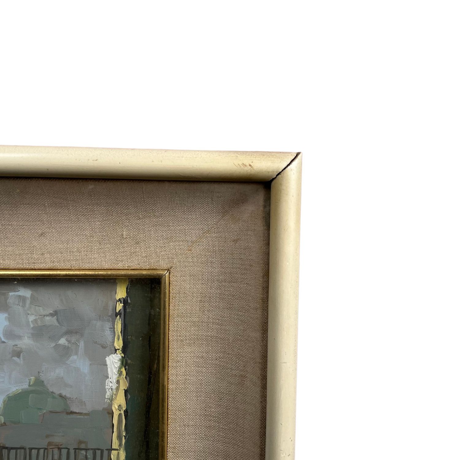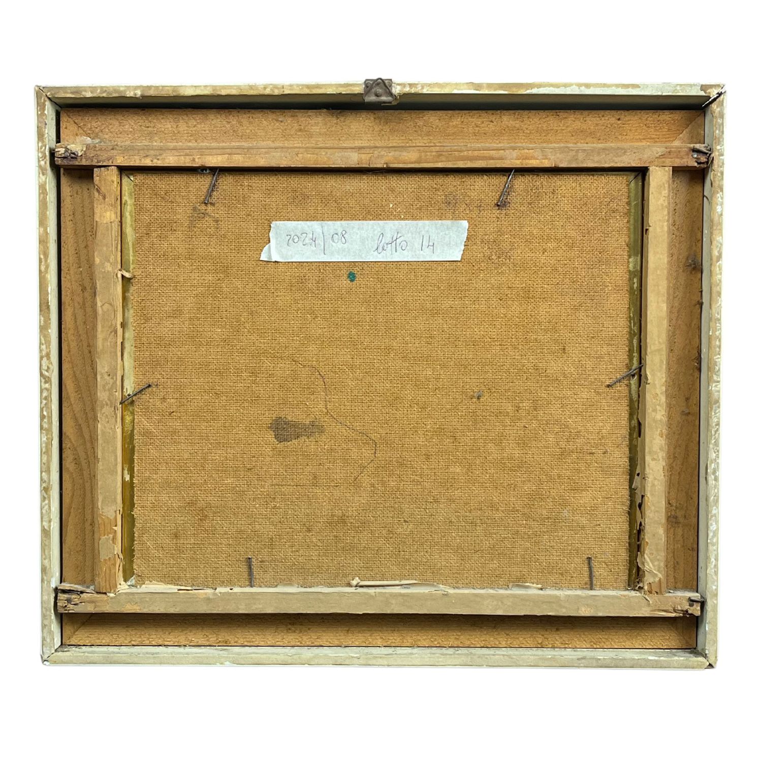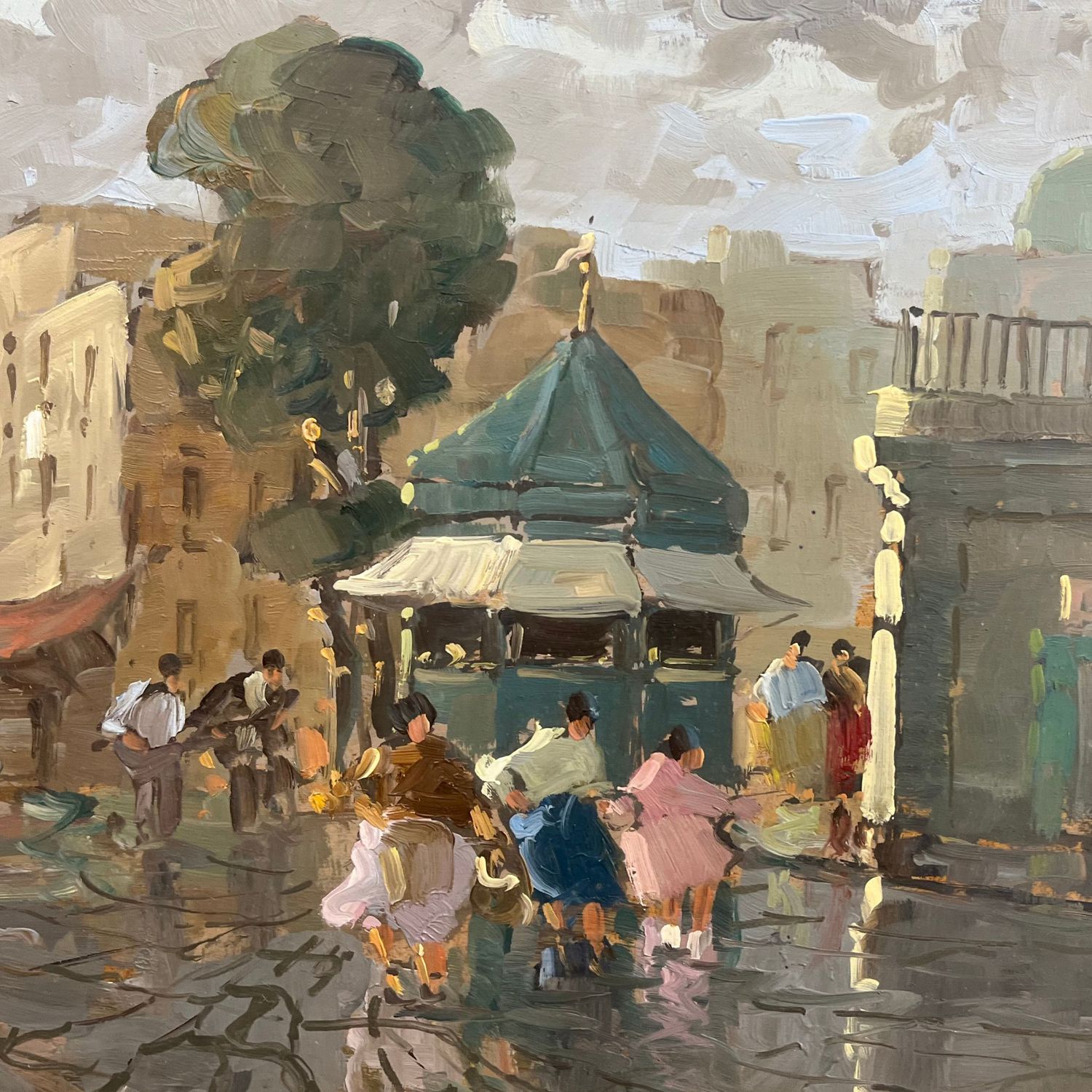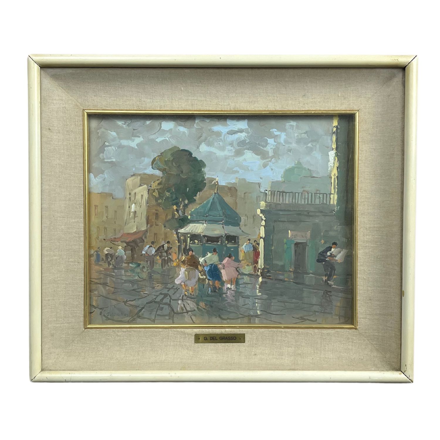 Dipinto olio su pannello, periodo XX secolo, raffigurante Strada con personaggi.