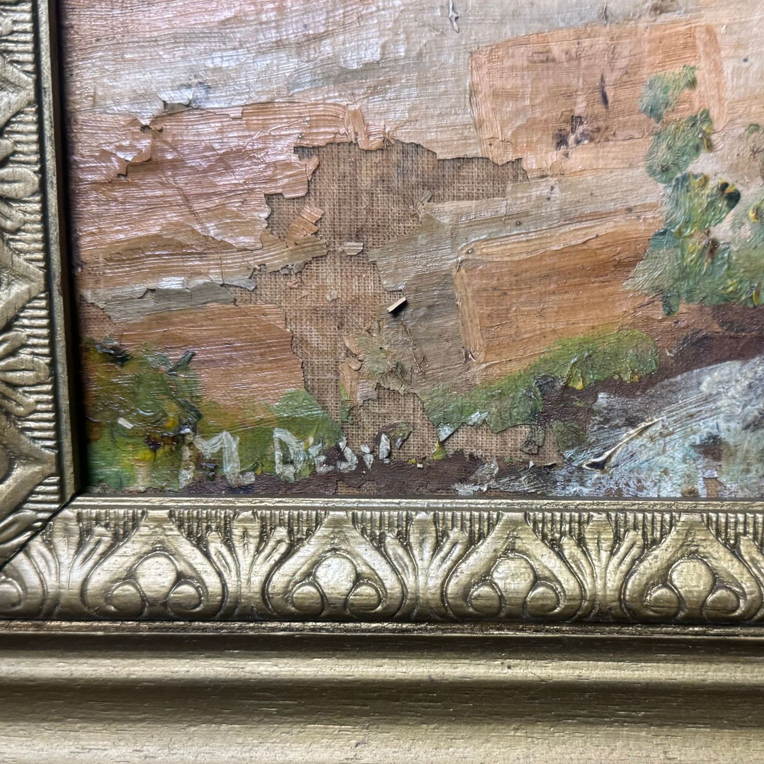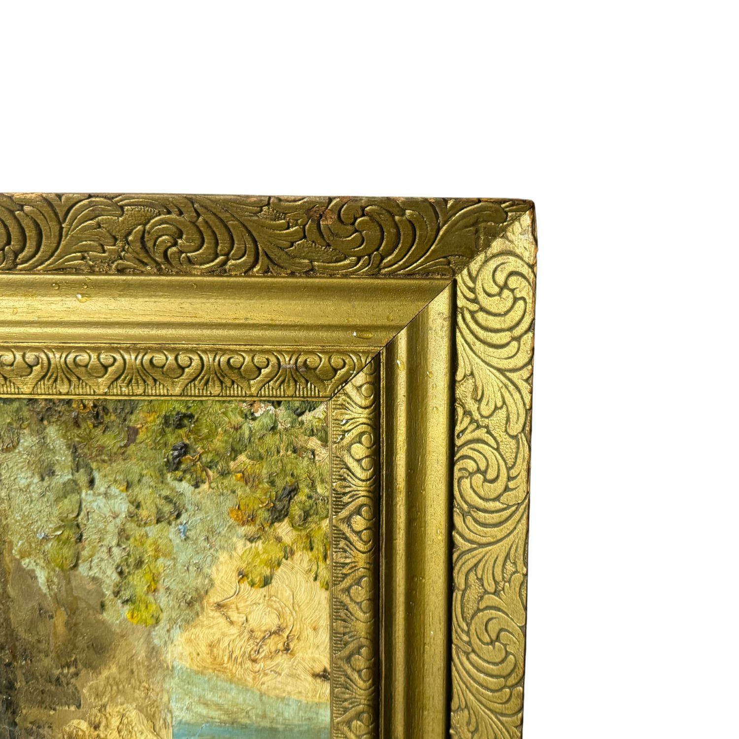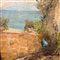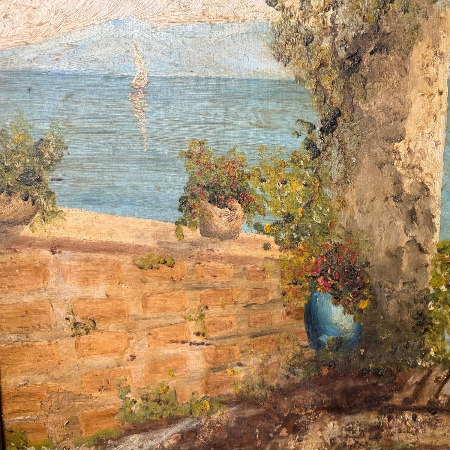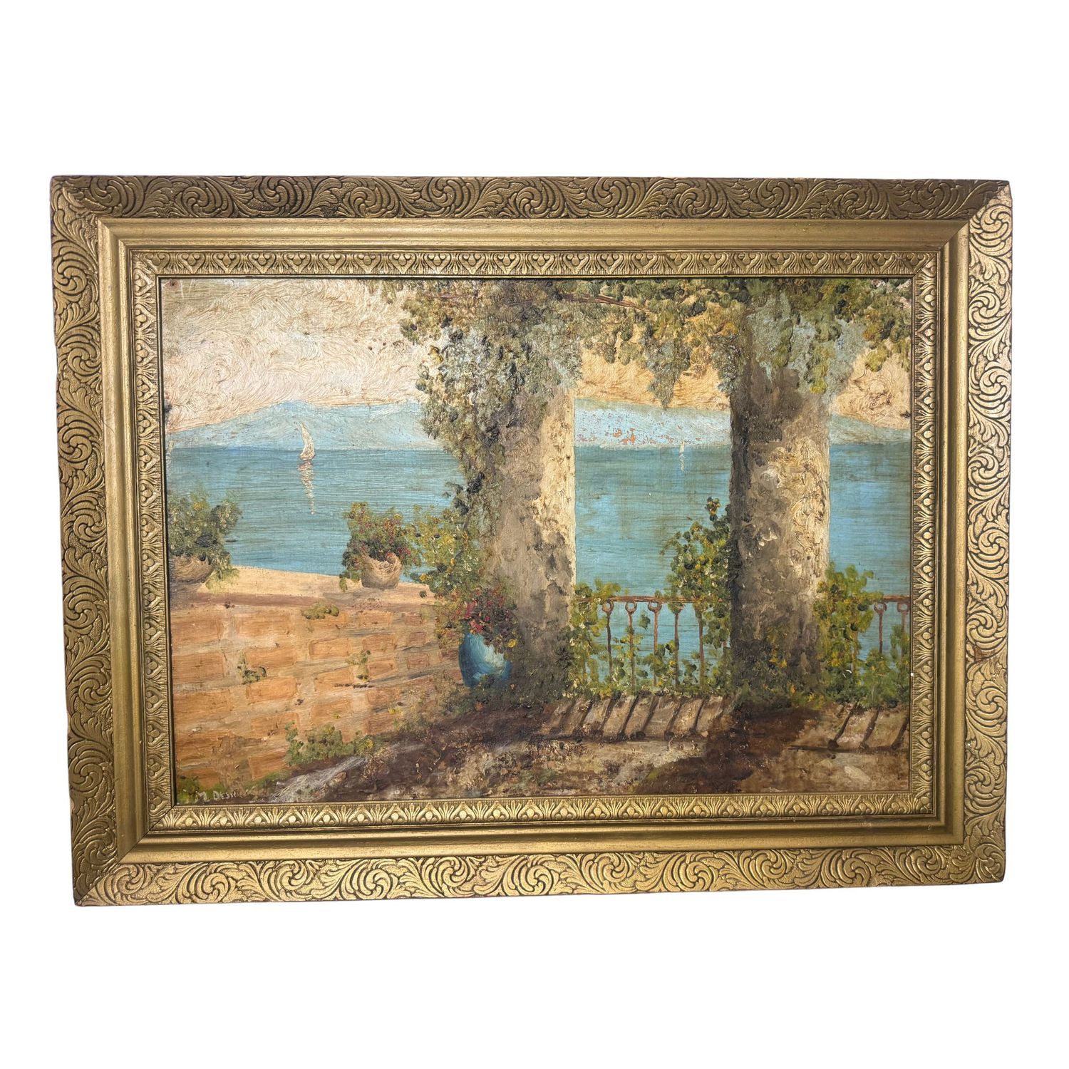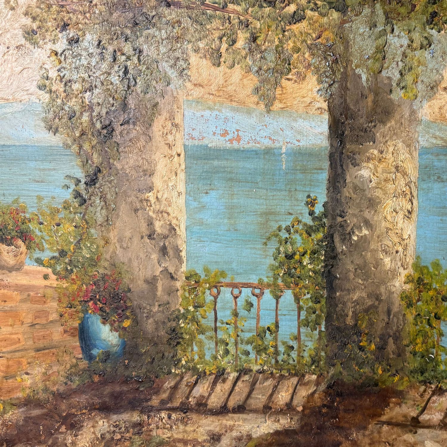 Dipinto olio su pannello, periodo XX secolo scuola Italiana, raffigurante Terrazza sul golfo.