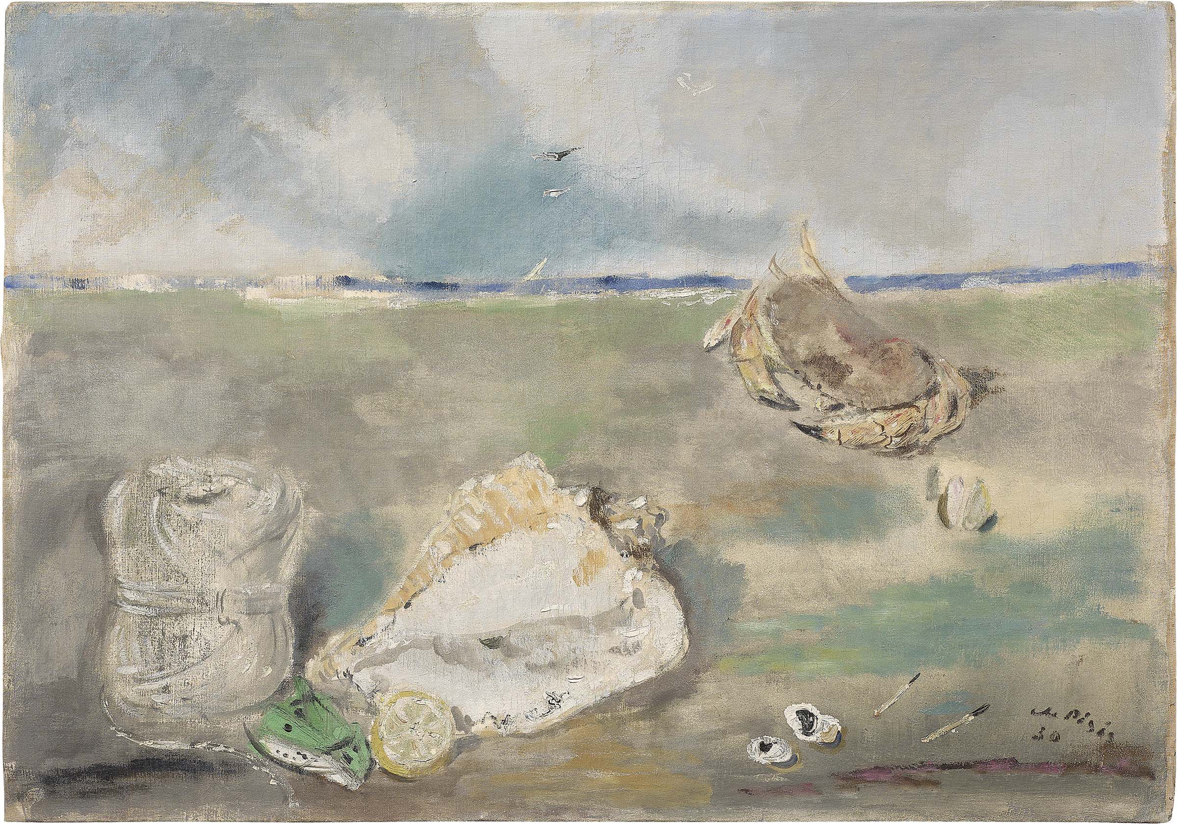 Filippo de Pisis Ferrara 1896 - Milano 1956 Natura morta marina, 1930 Olio su tela, cm. 66,5x95 Firma e data in basso a destra: de Pisis / 30. Al verso, sul telaio e sulla tela: due timbri Galleria Annunciata, Milano, con n. 2380. Storia: Galleria Annunciata, Milano; Collezione privata, Milano; Collezione privata Opera registrata dall'Associazione per Filippo de Pisis, Milano, arch. n. 02716. Esposizioni: De Pisis e Montale. "Le Occasioni" tra poesia e pittura, Mendrisio, Museo d'Arte, aprile - agosto 2012, illustrato; De Pisis en Voyage, Parma, Fondazione Magnani Rocca, 13 settembre - 8 dicembre 2013.