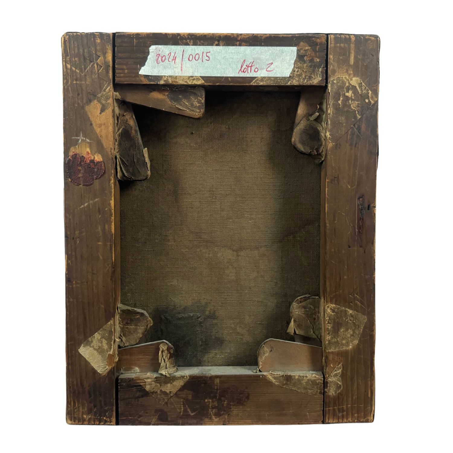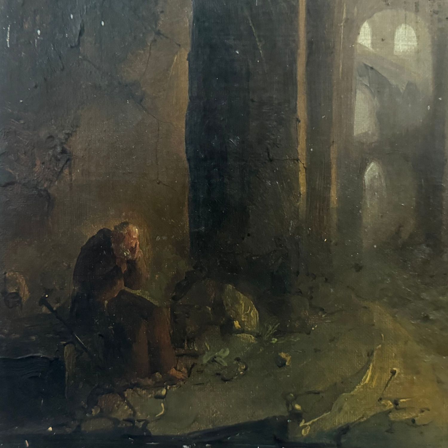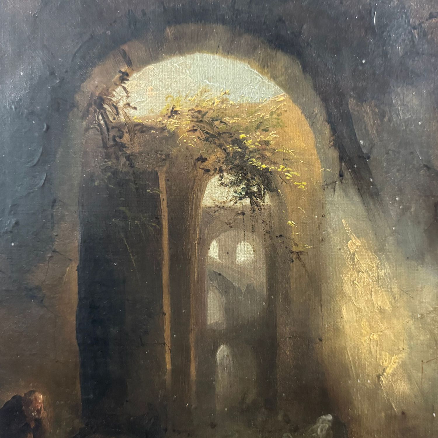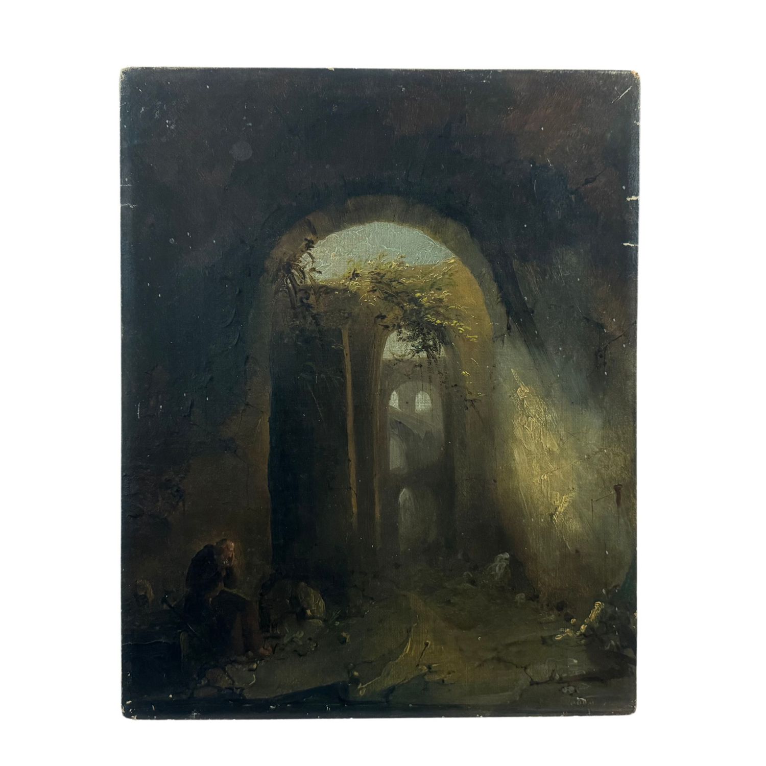 Dipinto olio su tela, raffigurante Grotta con monaco.