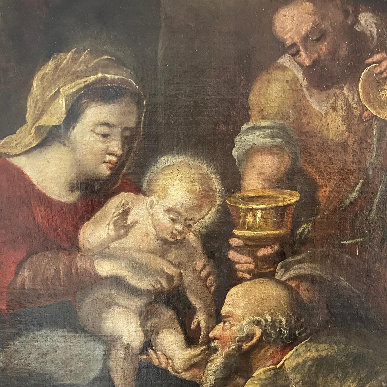 Dipinto olio su tela, raffigurante l'adorazione dei Re Magi, XIX secolo.