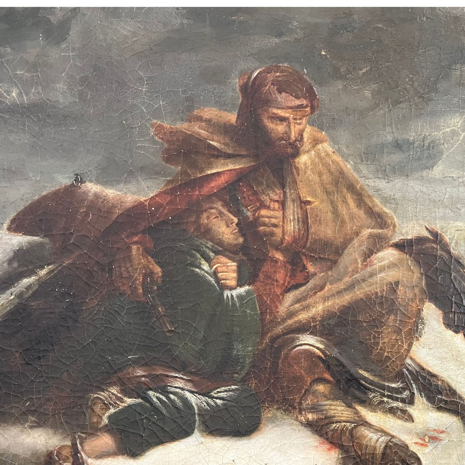 Dipinto olio su tela scuola Francese XIX secolo. Dimensioni 92x73 cm. Raffigurante Momento di pausa durante la battaglia Napoleonica in Russia. (Rintelo XX secolo). Tela con restauri e segni di vissuto.