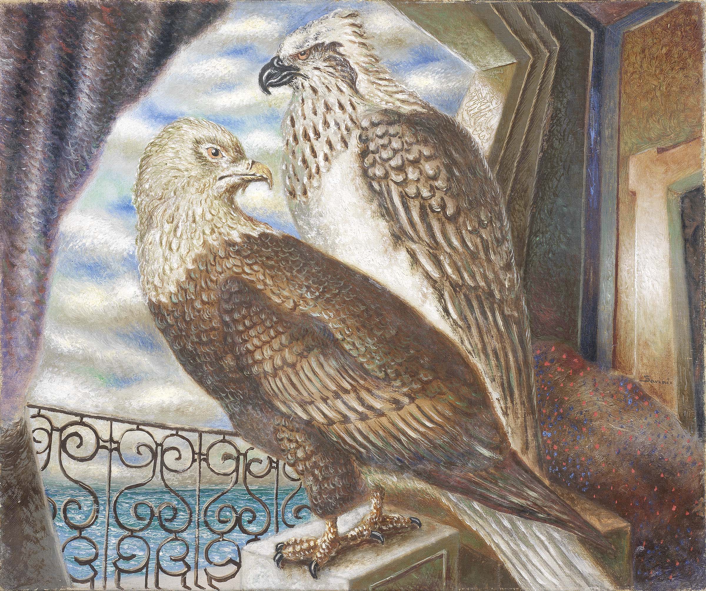 Alberto Savinio Atene 1891 - Roma 1952 Gardiens du Port o Gardiens d'Étoiles, 1930 Olio su tela, cm. 46x54.5 Firma in basso a destra: Savinio; titolo e firma al verso sul telaio: "Gardiens du Port" / Savinio. Storia: Collezione Ch. Pomaret, Galerie de la Reinassance, Parigi; Collezione Gianna Sistu, Galerie Île de France, Parigi; Collezione privata Bibliografia: Pia Vivarelli, Alberto Savinio. Catalogo generale, Electa, Milano, 1996, p. 110, n. 1930 46.