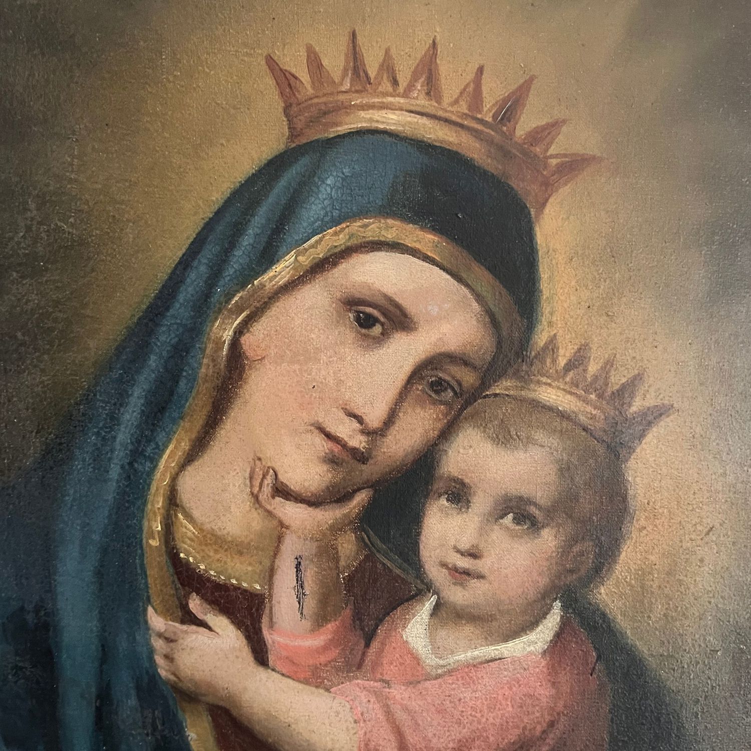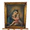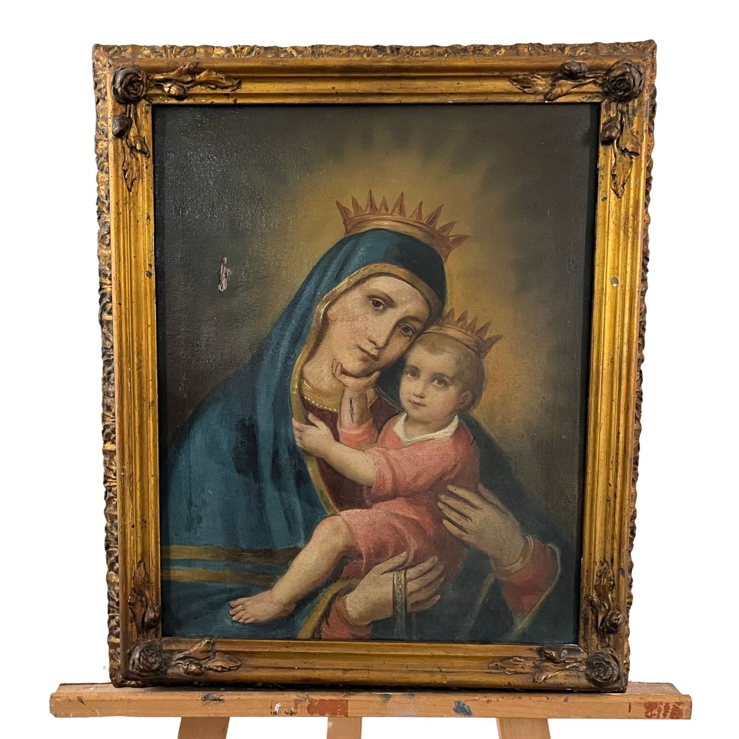 Dipinto olio su tela, raffigurante Madonna e Bambino. Periodo XIX secolo, riparazioni alla tela, piccoli punti di restauro, cornice dorata