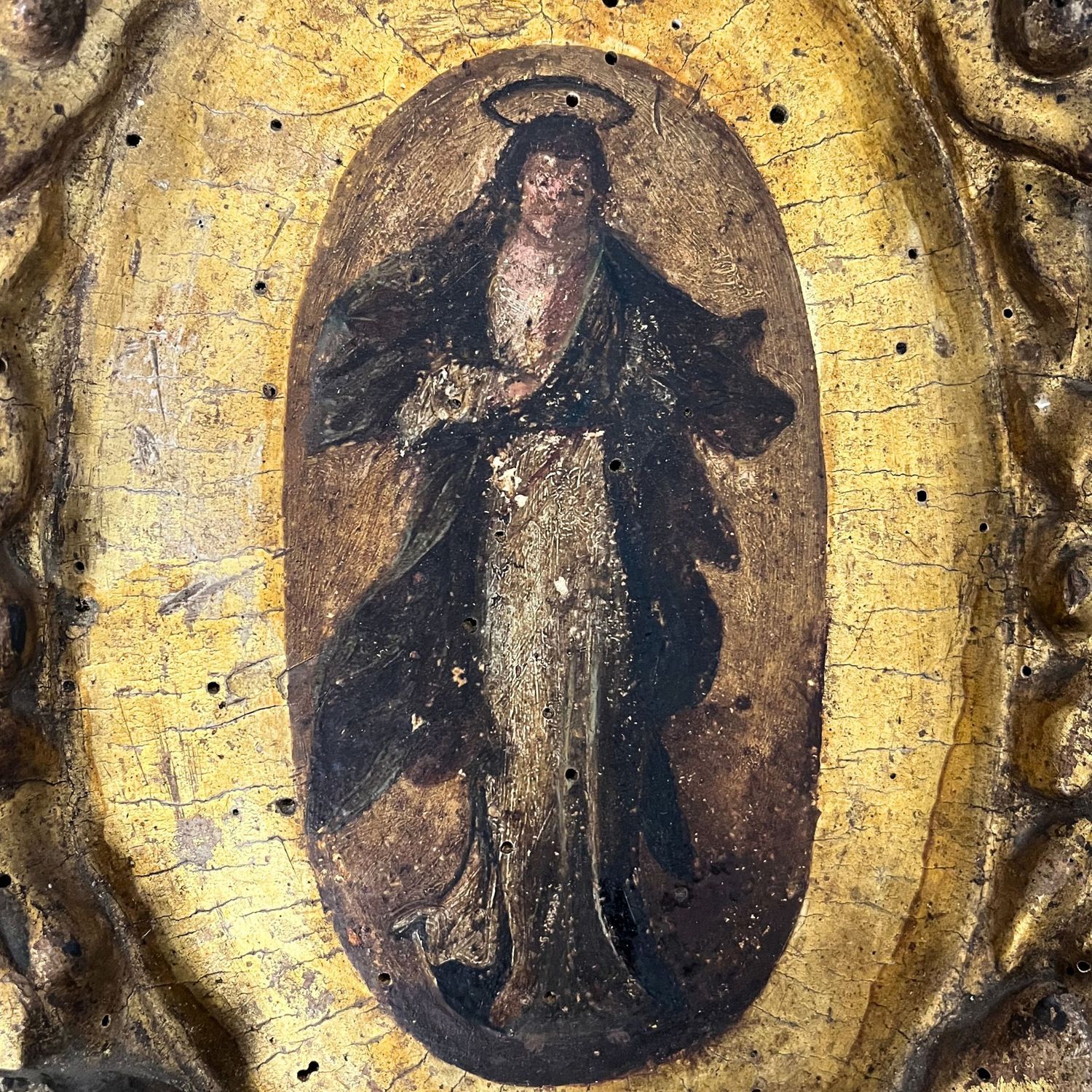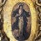Dipinto su fondo oro in cornice scolpita, periodo Italia XVII secolo, raffigurante figura sacra.