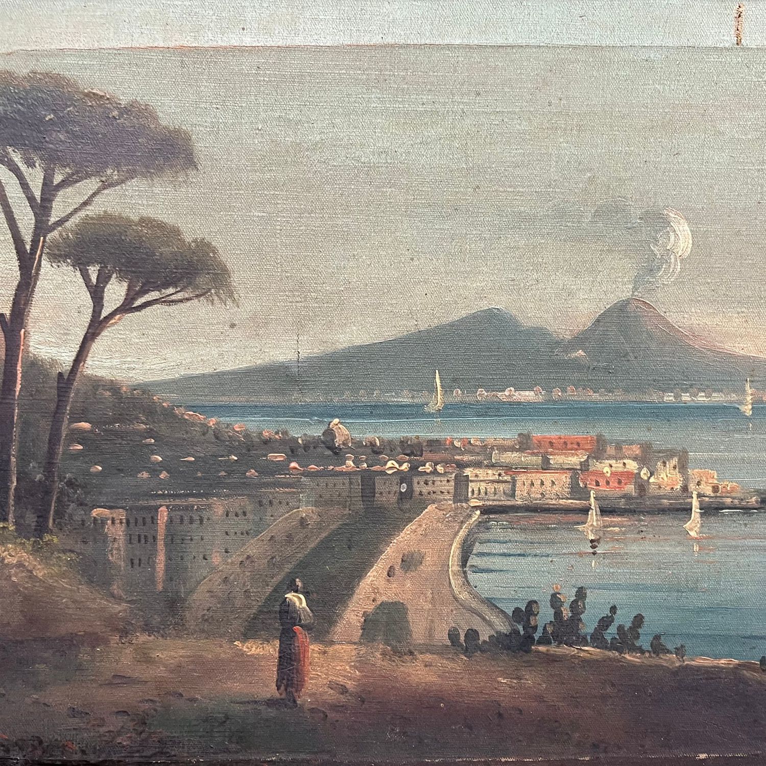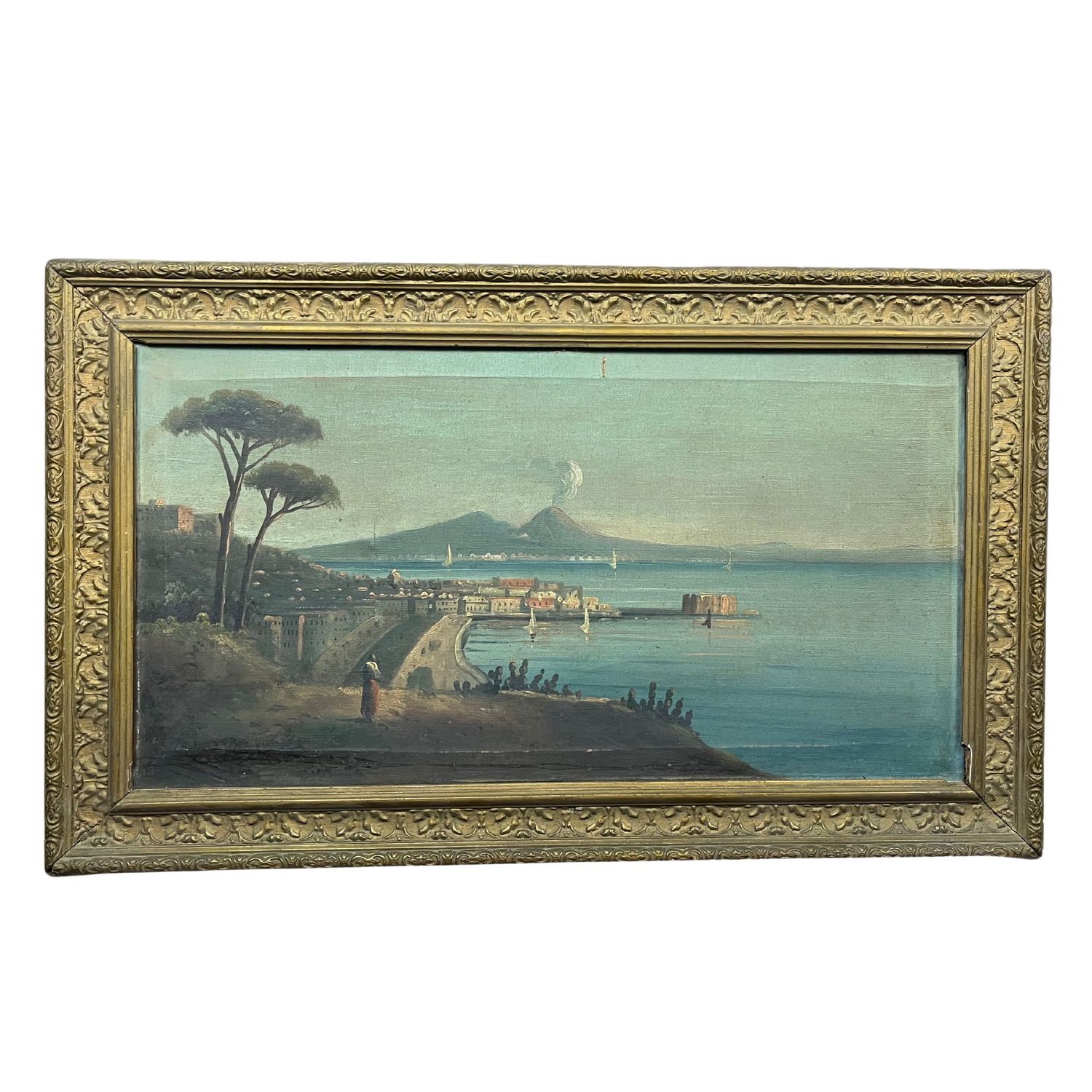 Dipinto olio su tela, periodo XIX/XX secolo, scuola Italiana (Napoletana), raffigurante Scorcio di marina napoletana e Vesuvio.