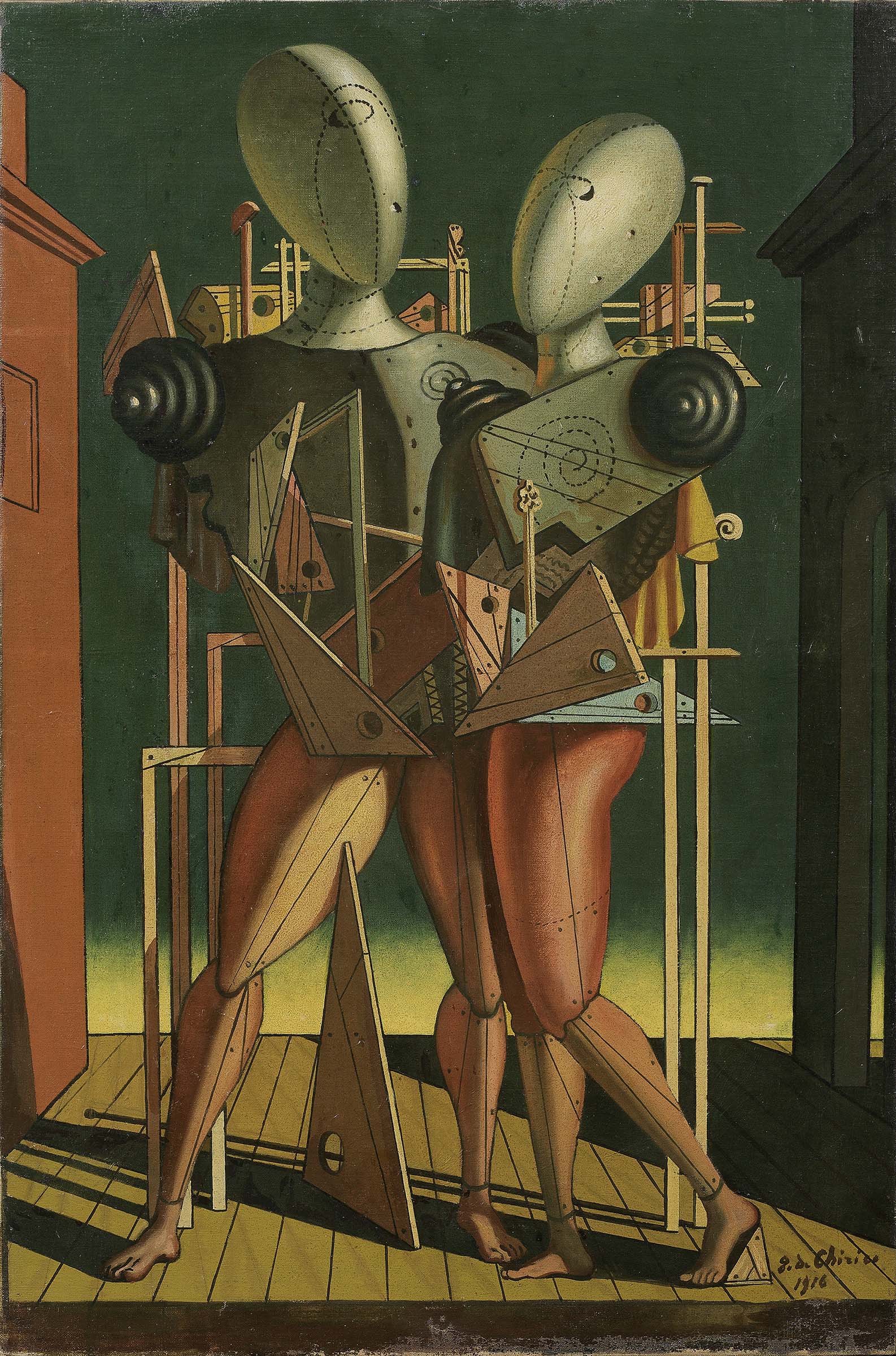 Giorgio de Chirico Volos 1888 - Roma 1978 Ettore e Andromaca, (1938-40) Olio su tela, cm. 76x50 Firma in basso a destra: G. de Chirico / 1916. Al verso sul telaio: etichetta Frankfurter Kunstverein Steinernes Haus Ausstellung Italien 1905-25 / (1963/64) / kat. nr. 44: etichetta con timbro Galleria d'Arte Maggiore / Bologna / Metafisico Primo Il Grande / Giorgio de Chirico e qualche amico pittore / 4 dicembre 2004 - 14 febbraio 2005. Storia: Collezione Antonio Mazzotta, Milano; Collezione privata Foto autenticata dall'artista in data 22-7-1940; perizia di Paolo Baldacci, 14 aprile 2003 e 18 gennaio 2005. Il materiale relativo all'opera è stato inviato alla Fondazione Giorgio e Isa de Chirico per l'archiviazione. Esposizioni: Italien 1905/1925. Futurism und Pittura metafisica, Francoforte, Kunstverein, 16 novembre 1963 - 5 gennaio 1964, cat. n. 44; Hitchcock et l'Art. Coïncidences fatales, Montreal, Musée des Beaux Arts, 16 novembre - 18 marzo 2001, poi Parigi, Centre Georges Pompidou, 6 giugno - 24 settembre 2001, cat. p. 302, illustrato; Max Ernst e i suoi amici surrealisti, a cura di Arturo Schwarz, Roma, Museo del Corso, 25 luglio - 3 novembre 2002, illustrato; La Condició Humana, Barcellona, Museu d'Historia de la Ciutat, 9 maggio - 29 settembre 2004, illustrato; Metafisico Primo il Grande. Giorgio de Chirico e qualche amico pittore, testi di Luigi Cavallo, Bologna, Galleria d'Arte Maggiore, 4 dicembre 2004 - 14 febbraio 2005, cat. p. 96, n. 3, illustrato a colori. Bibliografia: Ernesto Montù, Masterpieces of modern Italian art, Il Radiogiornale, Milano, 1950, p. n.n. (illustrato a colori, con misure errate); Un sogno d'arte di Luisa e Francesco, opere dalla collezione Mazzotta, Mastergraph, Milano, 2008, pp. 62, 63.