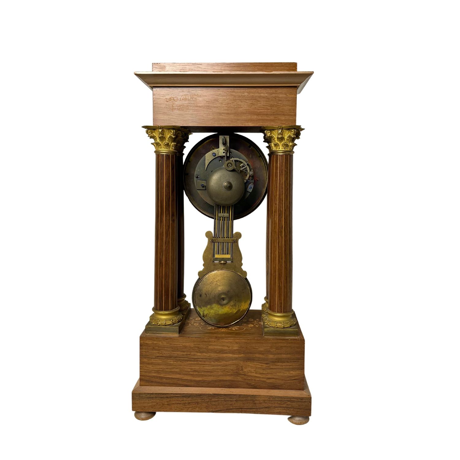 Orologio a pendolo, periodo Carlo X, periodo XIX secolo, ornato di Capitelli in bronzo finemente scolpiti, quadrante di forma tonda in lamiera numerata. Pendolo in bronzo e cassa in legno interamente intarsiato a motivo floreale. Legno Palissandro piccoli segni di vissuto.