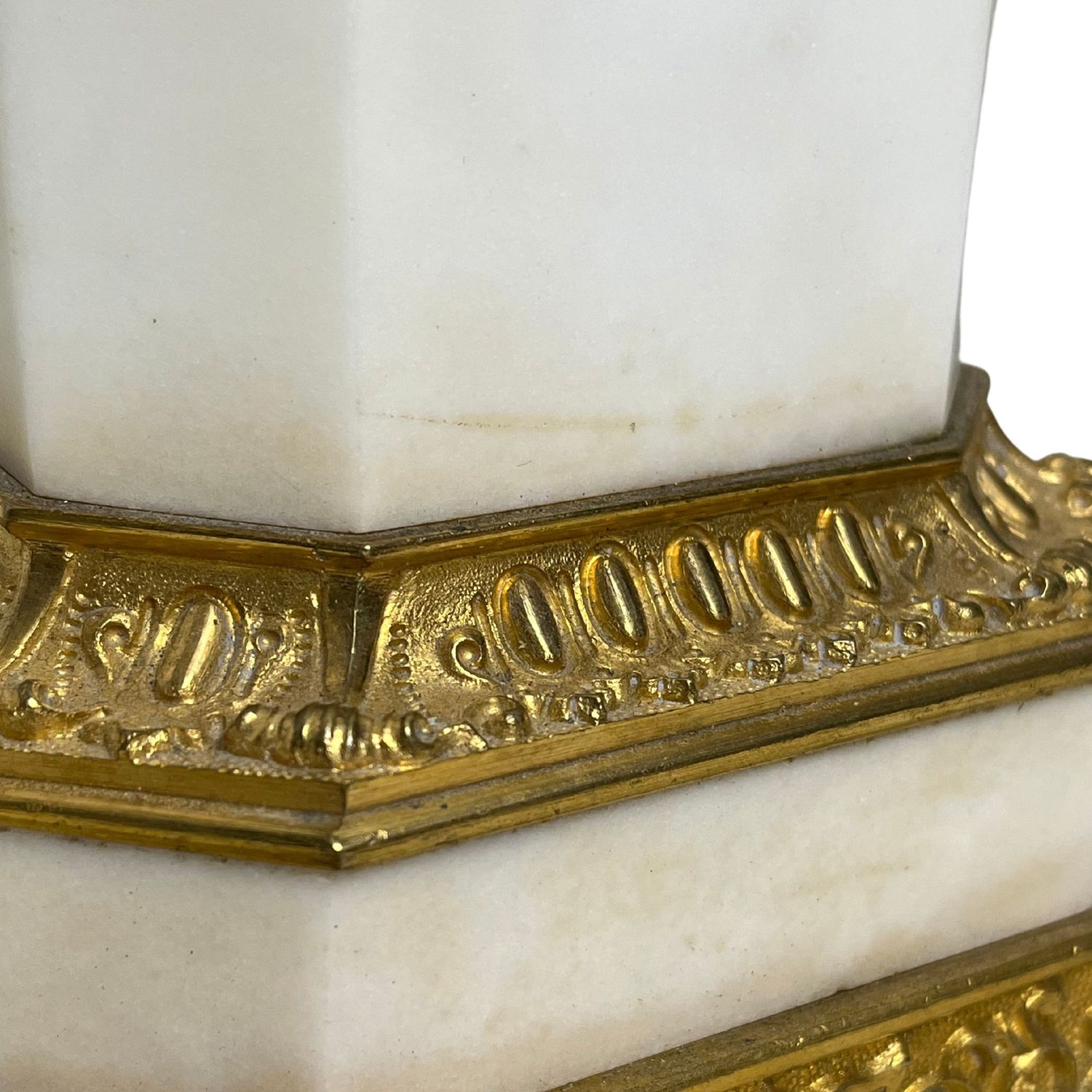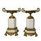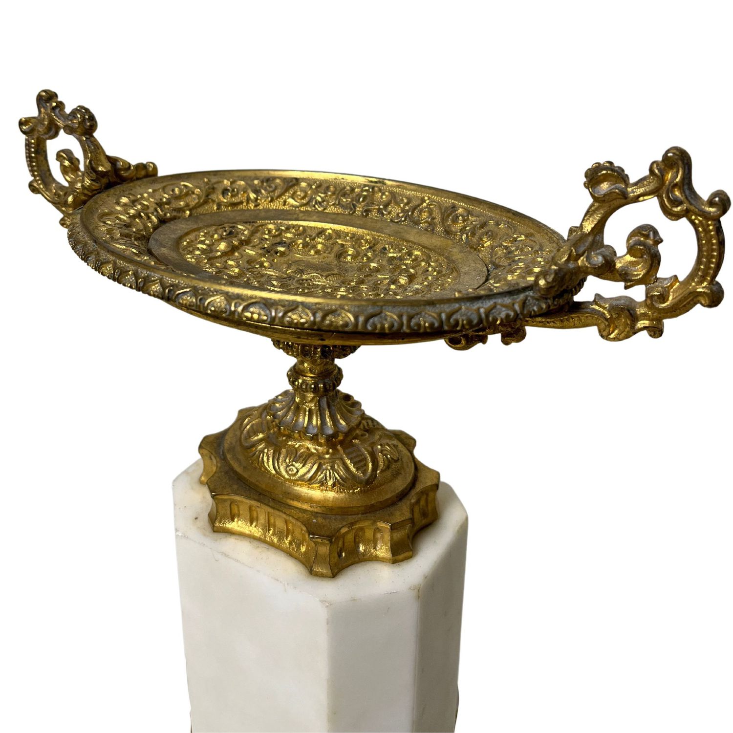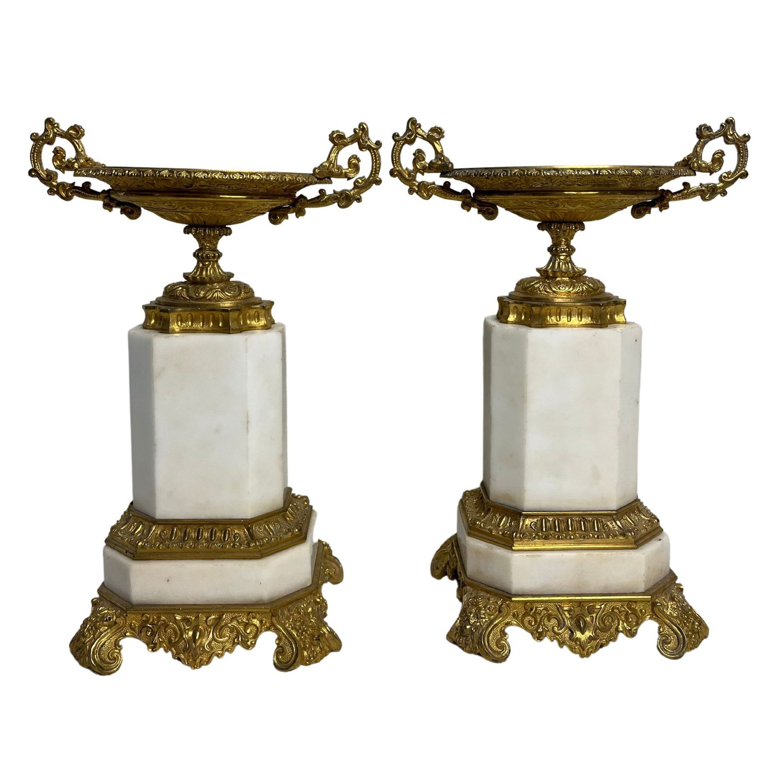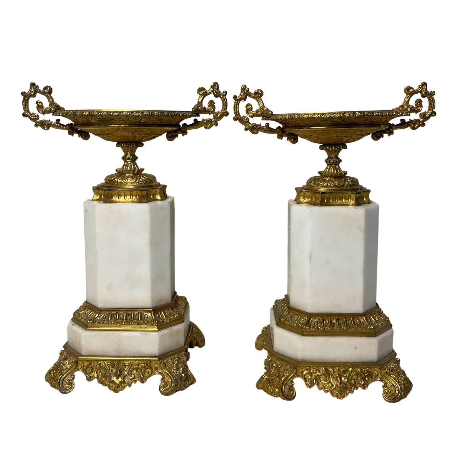 Coppia di alzate in bronzo dorate, finemente cisellato, sorrette da basi in marmo bianco. Periodo XIX secolo.