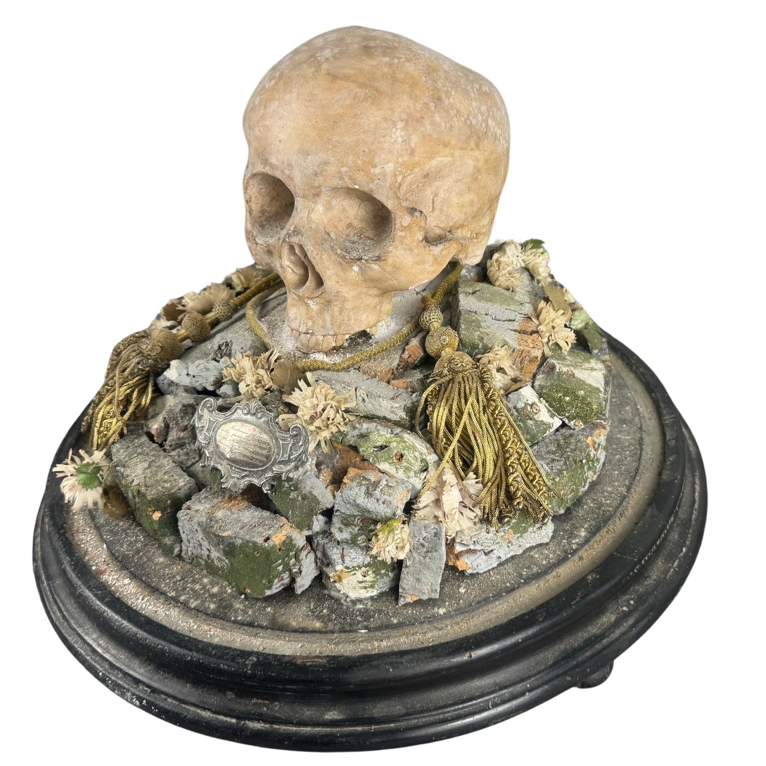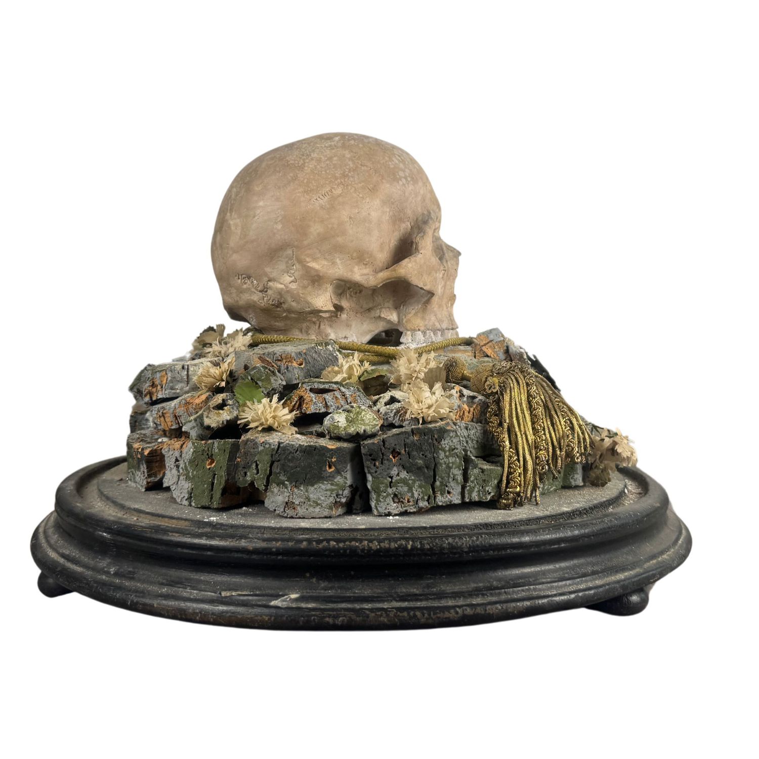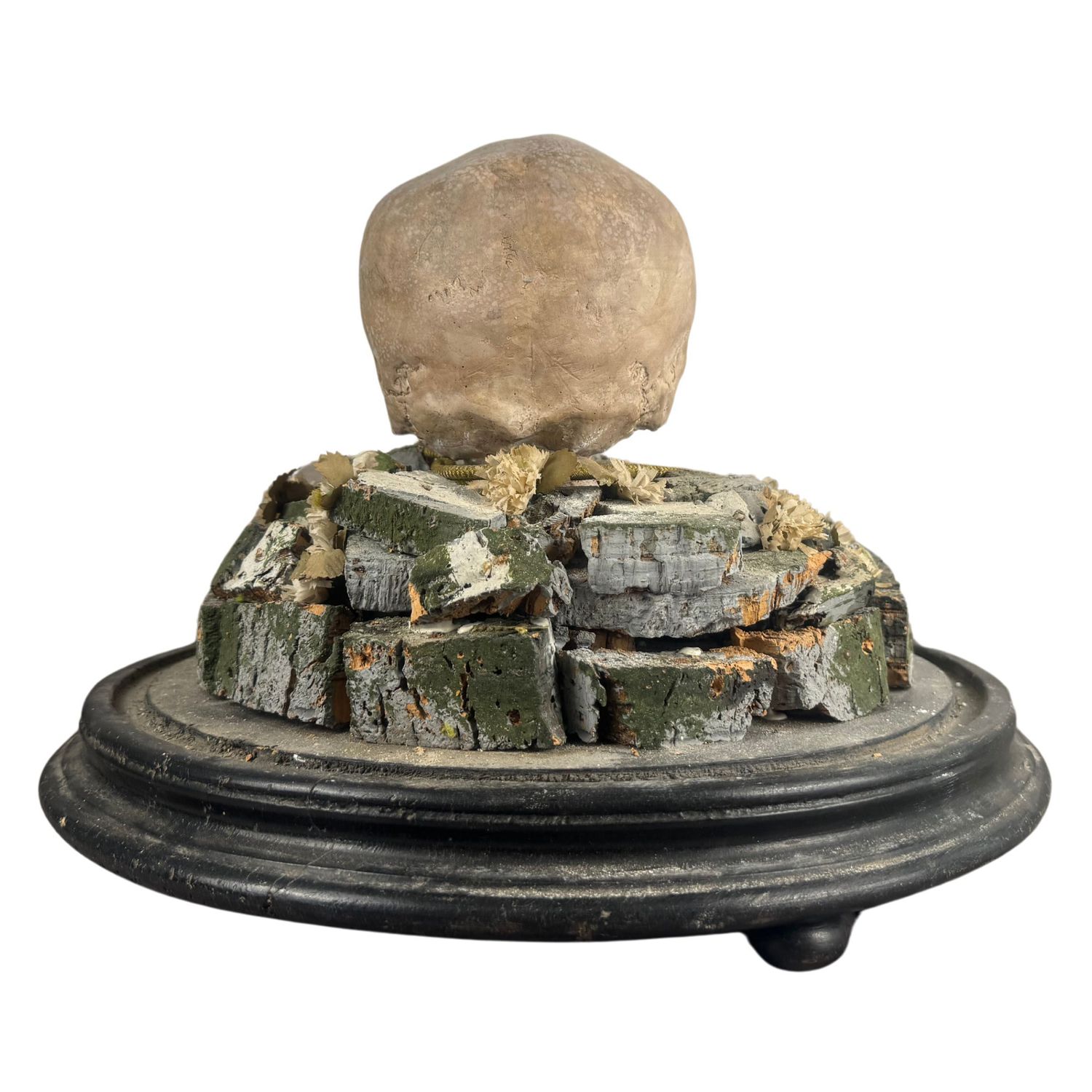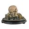 Teschio in scagliola sotto campana di vetro con base in legno.